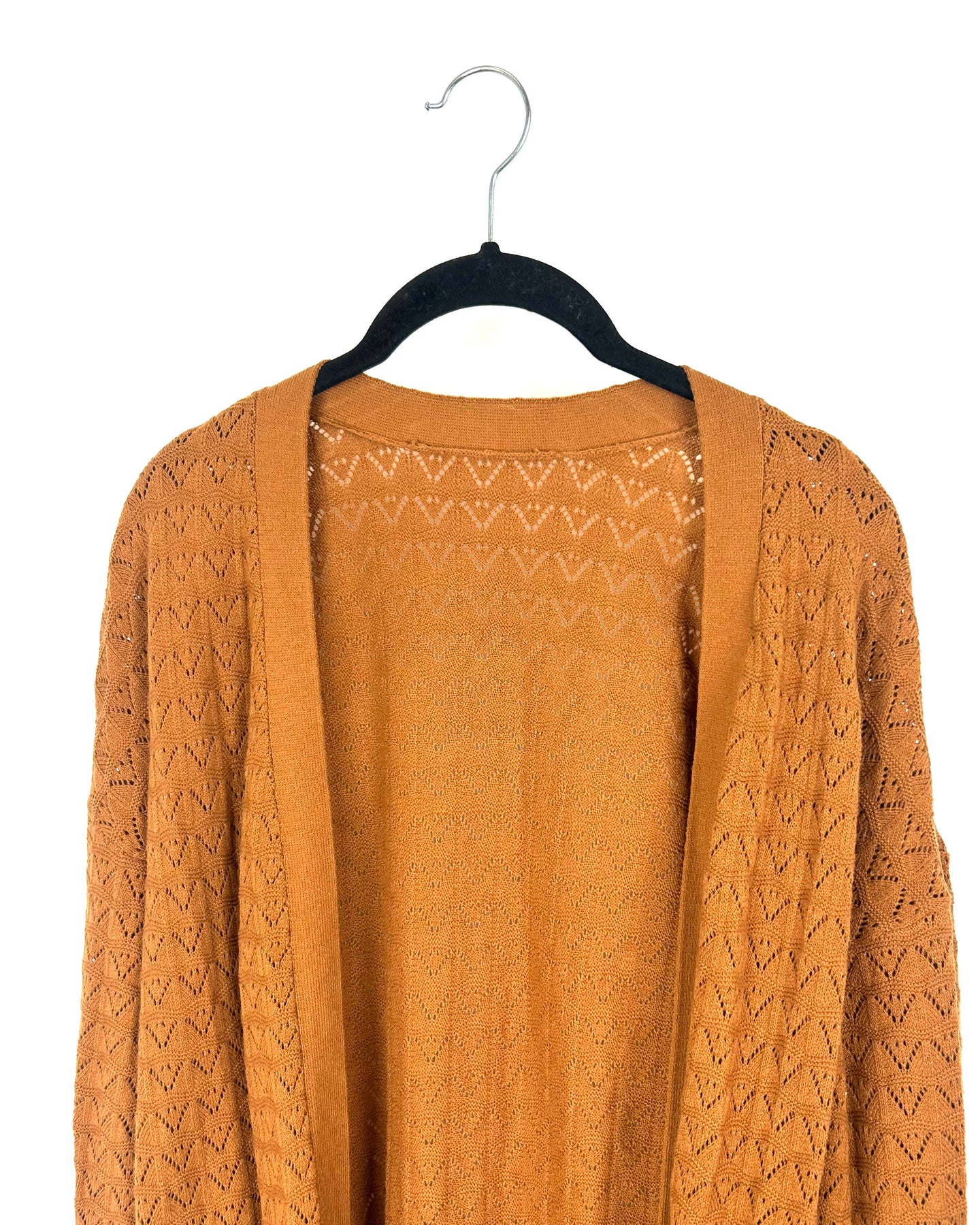 Burnt orange long cardigan sweater with no buttons, triangle pattern design, two functional pockets, light thin fabric, and two slits on the bottom side of the hem.