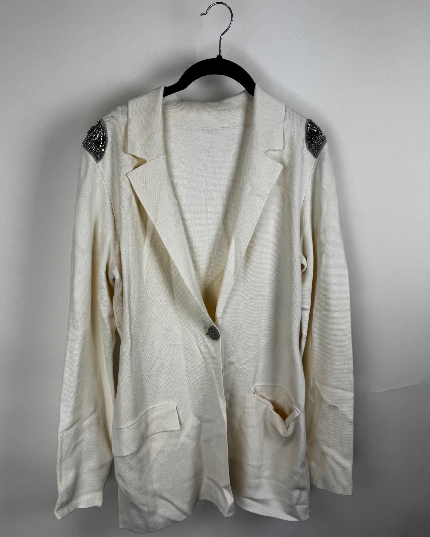Cream button down sweater with silver gemstone shoulder pads, front pockets, soft, heavyweight, v-neckline, and cozy