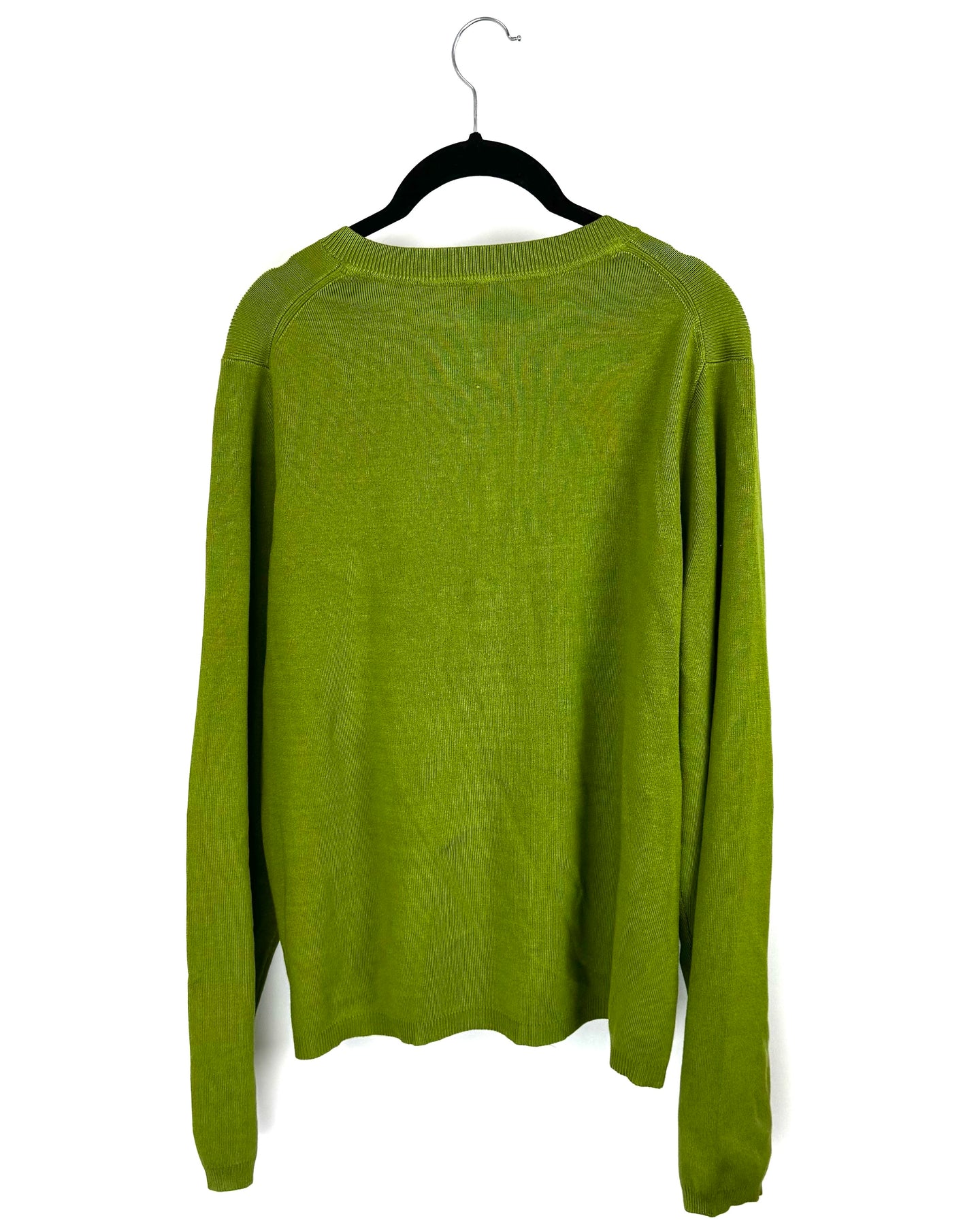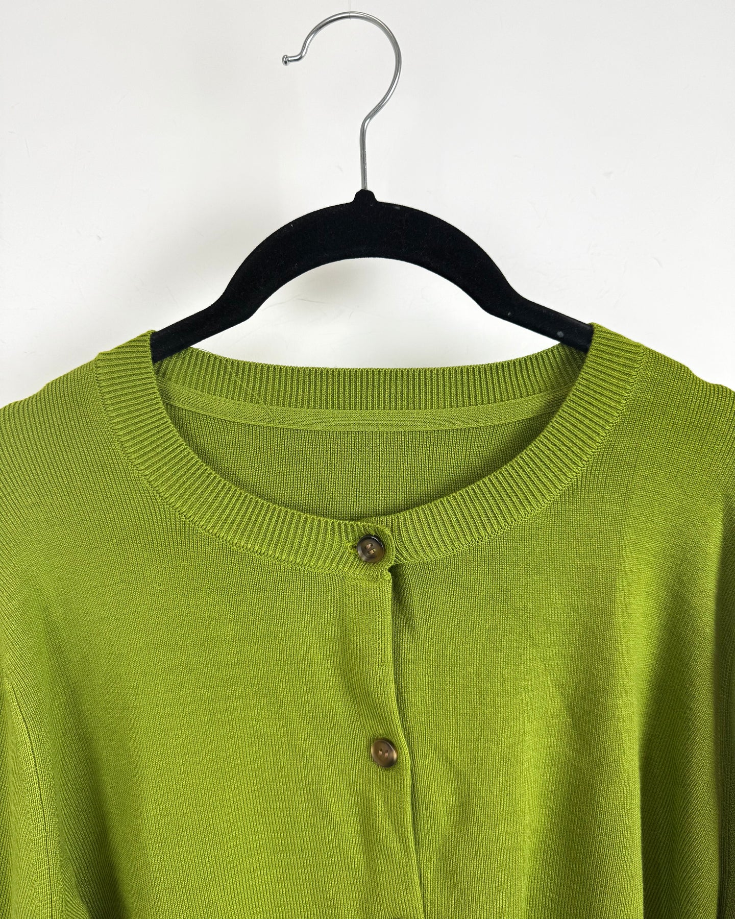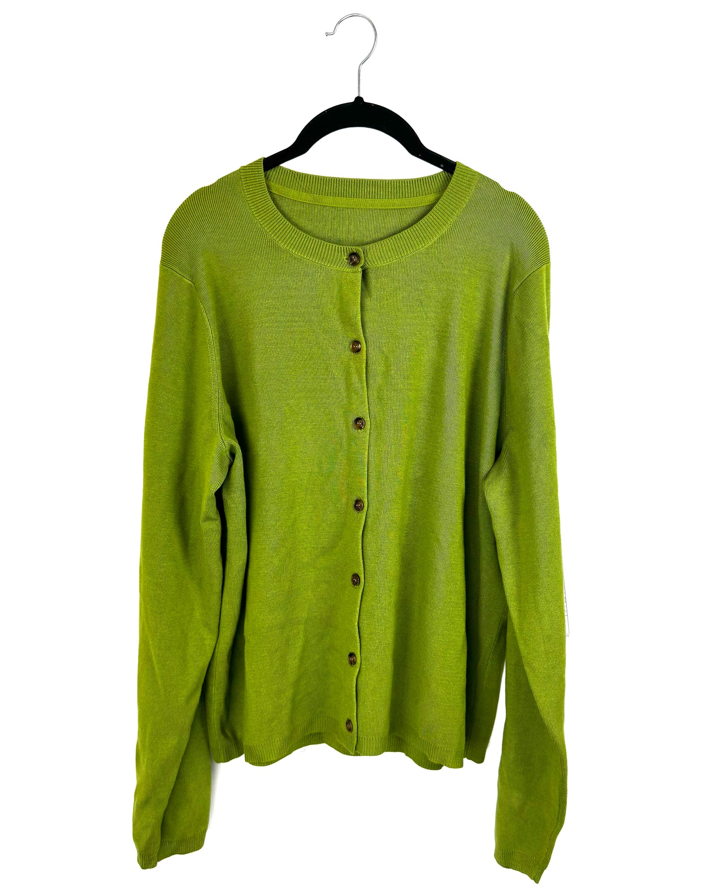 Green crewneck sweater with a button-down front, with marbled brown and black buttons
