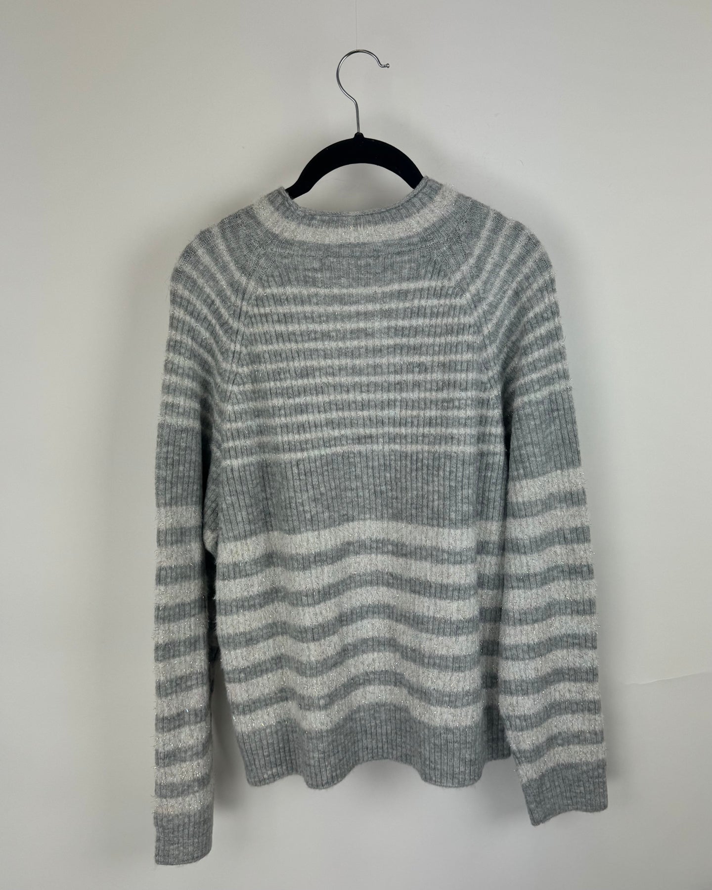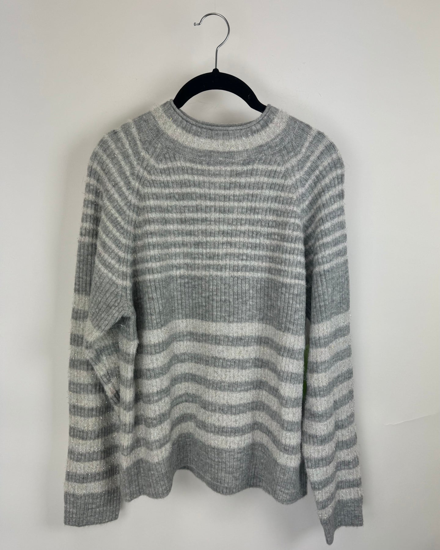 Reunited grey and white striped sweater with mock neckline and holographic detailing in a soft fabric