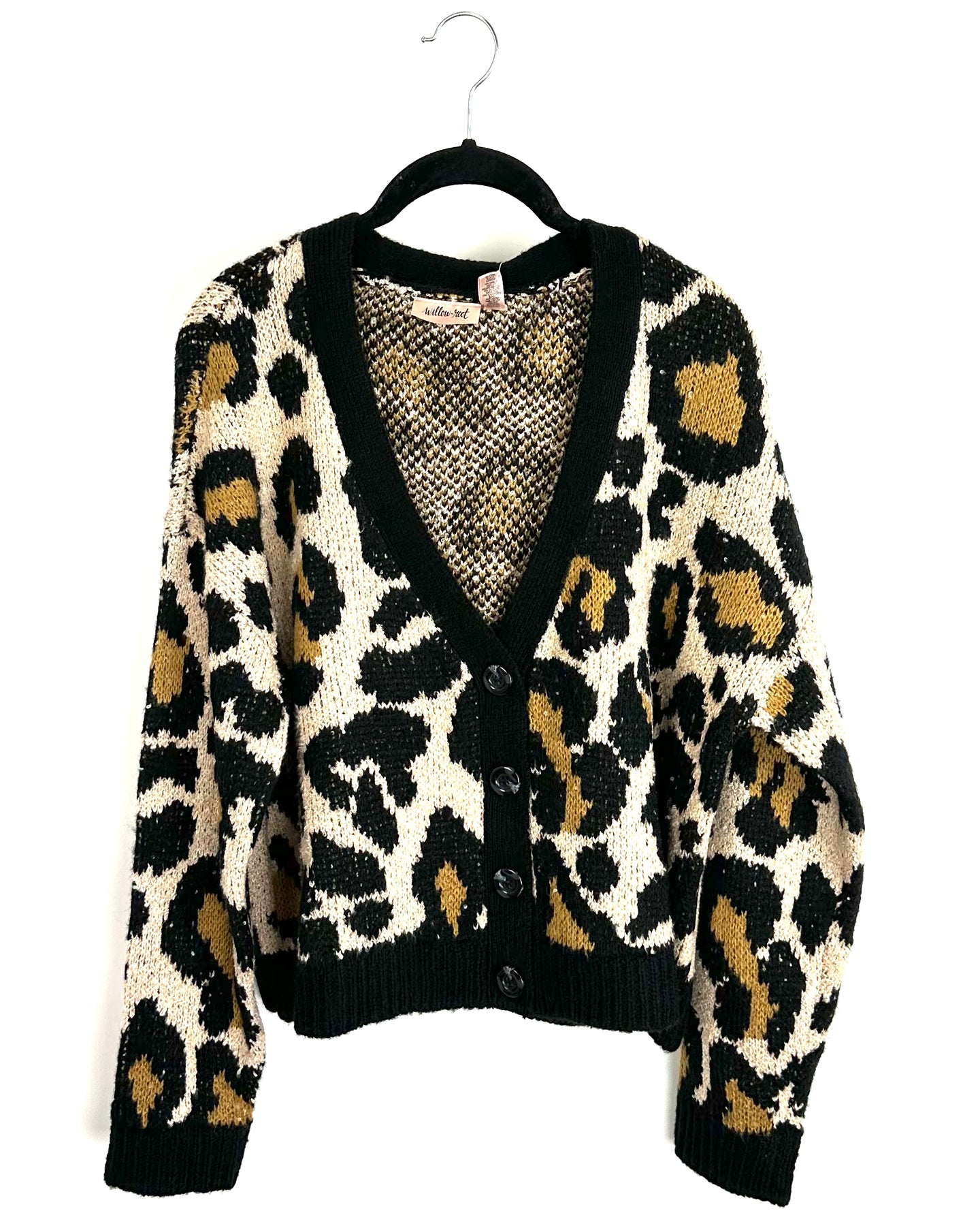 Beige cardigan sweater, knit material fabric with black and tan leopard print pattern, v-neckline with marbled black button closure, drop shoulder long sleeves, with black trim detailing and ribbed cuffs and hemline
