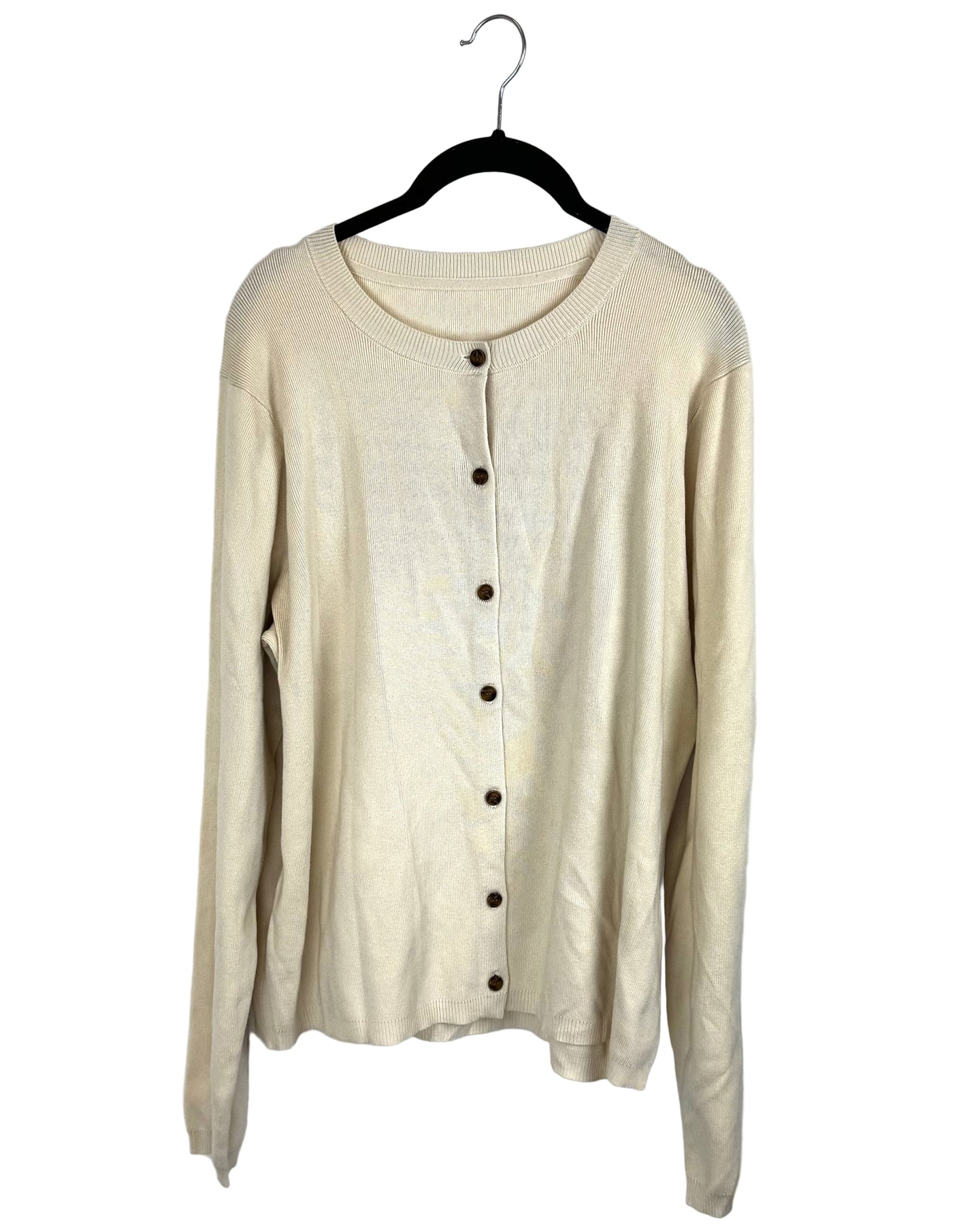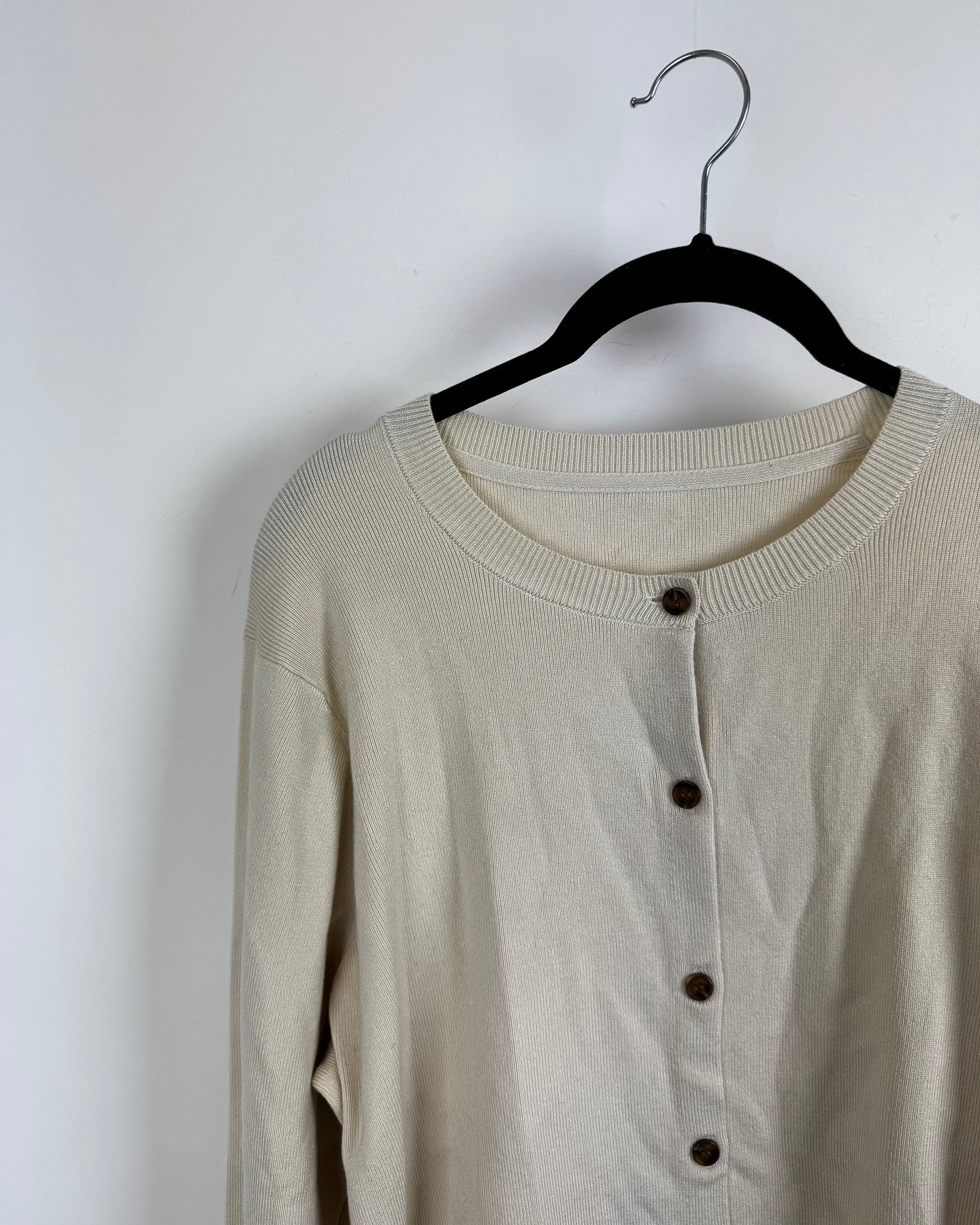 Light Beige crewneck sweater with a button-down front, with marbled brown and black buttons