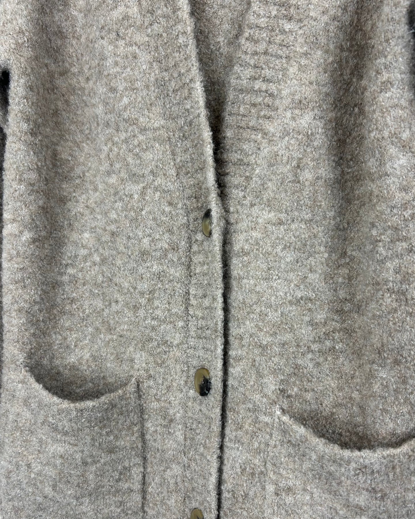 Light brown long button-up cardigan with five functional brown buttons, two pockets, thick heavy and stretchy fabric and a v-neckline.