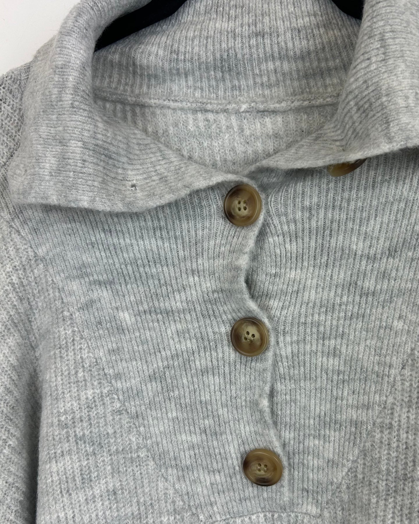 Gray knit collared sweater with functional brown buttons can be buttoned all the way to the top, balloon style sleeves, slightly cropped, soft and comfortable fabric with a ribbed detail.