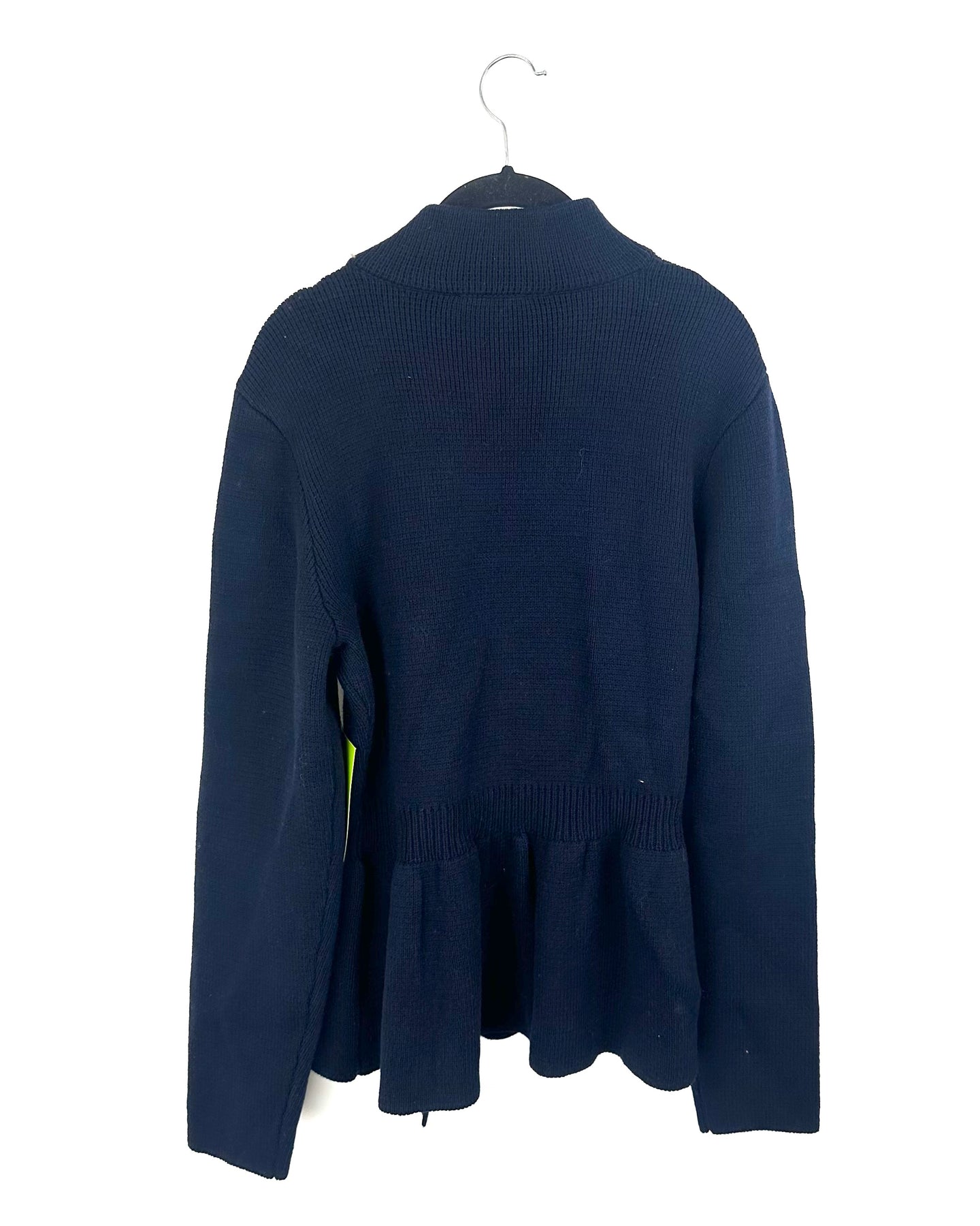 Reunited long sleeve navy blue sweater with two rows of buttons down the middle and peplum bottom in a soft sweater fabric