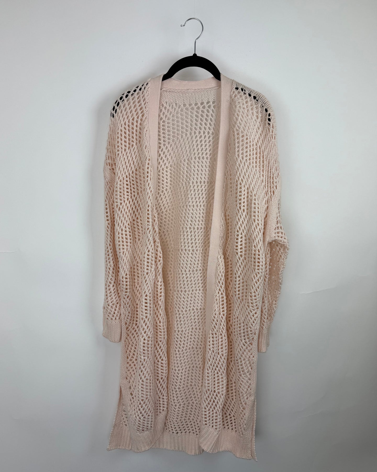 Light pink open-front cardigan in an oversized and full length style, with a lightweight and soft crochet knit pattern, side slits, and ribbed detailing at cuffs and hemline