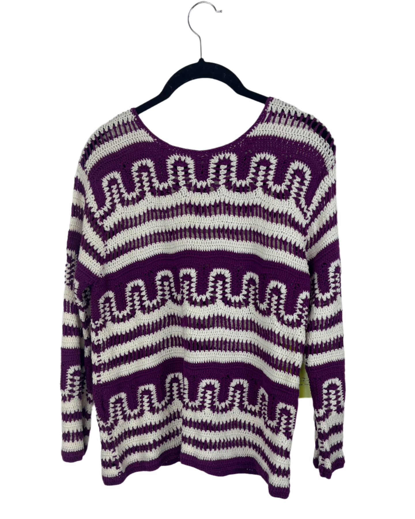 Purple and white striped crochet knit sweater with scoop neckline, and slight cropped sleeves that measure 19inches from the shoulder.