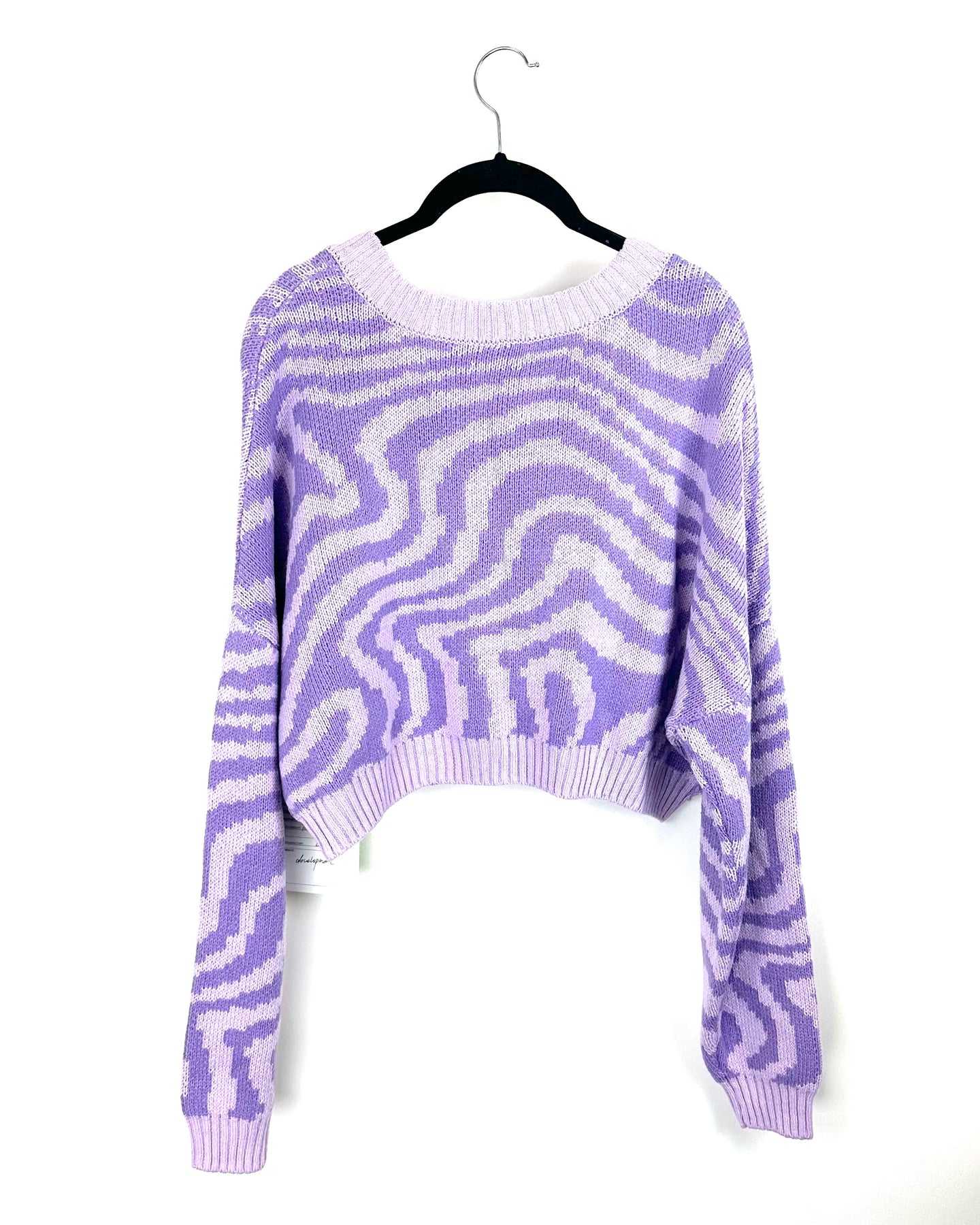 Purple cropped sweater, with a zebra print in light purple and purple color, V neckline, in a light knit material