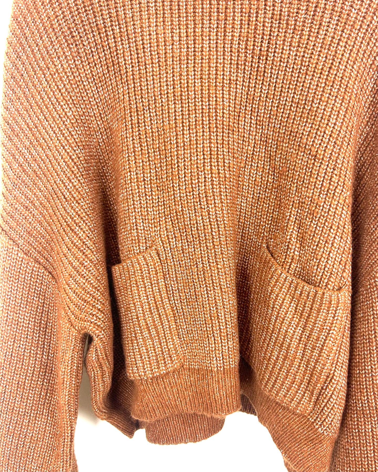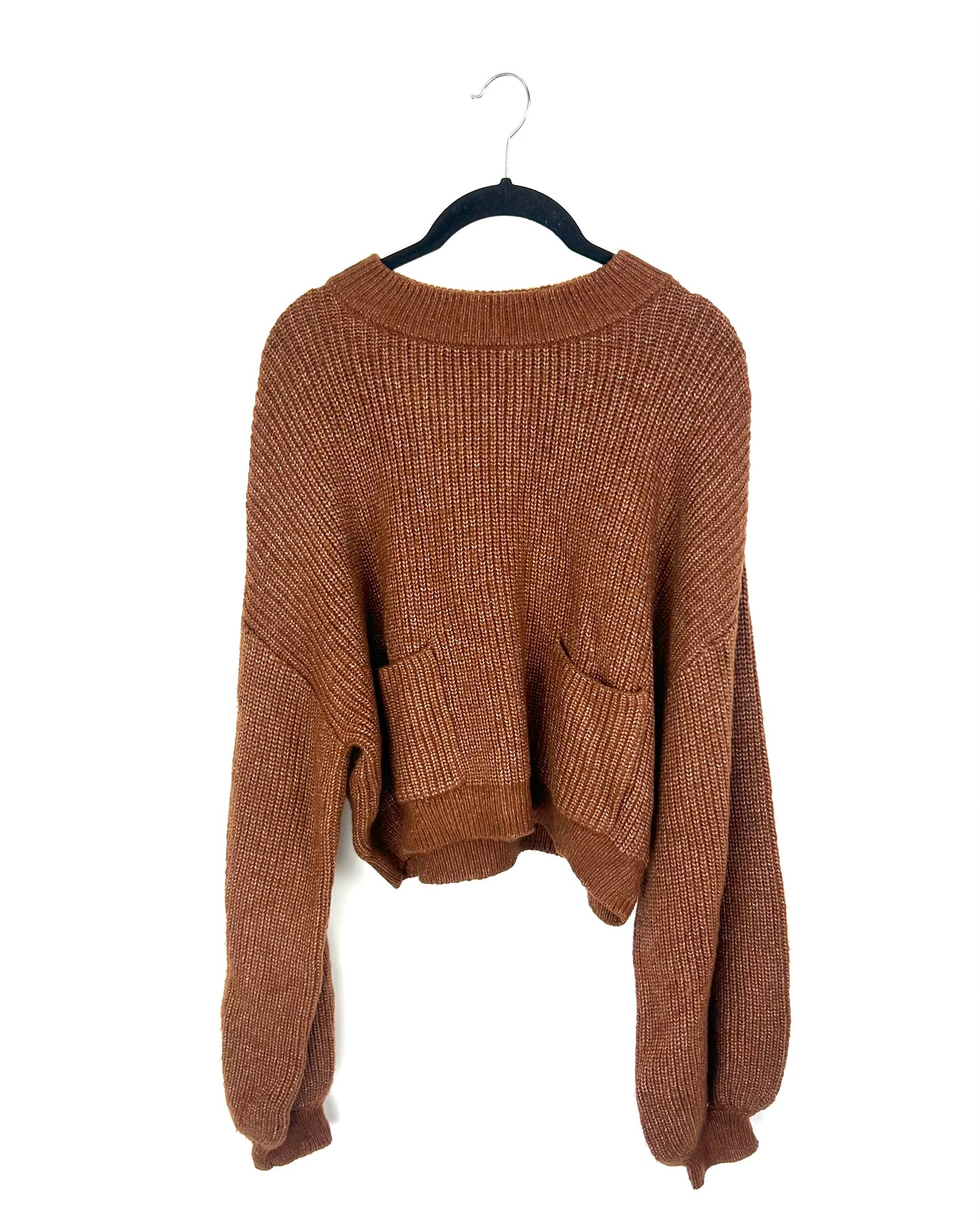Rust colored cropped knit sweater with two front pockets, balloon style sleeves, a crew neckline, and a thick soft fabric.