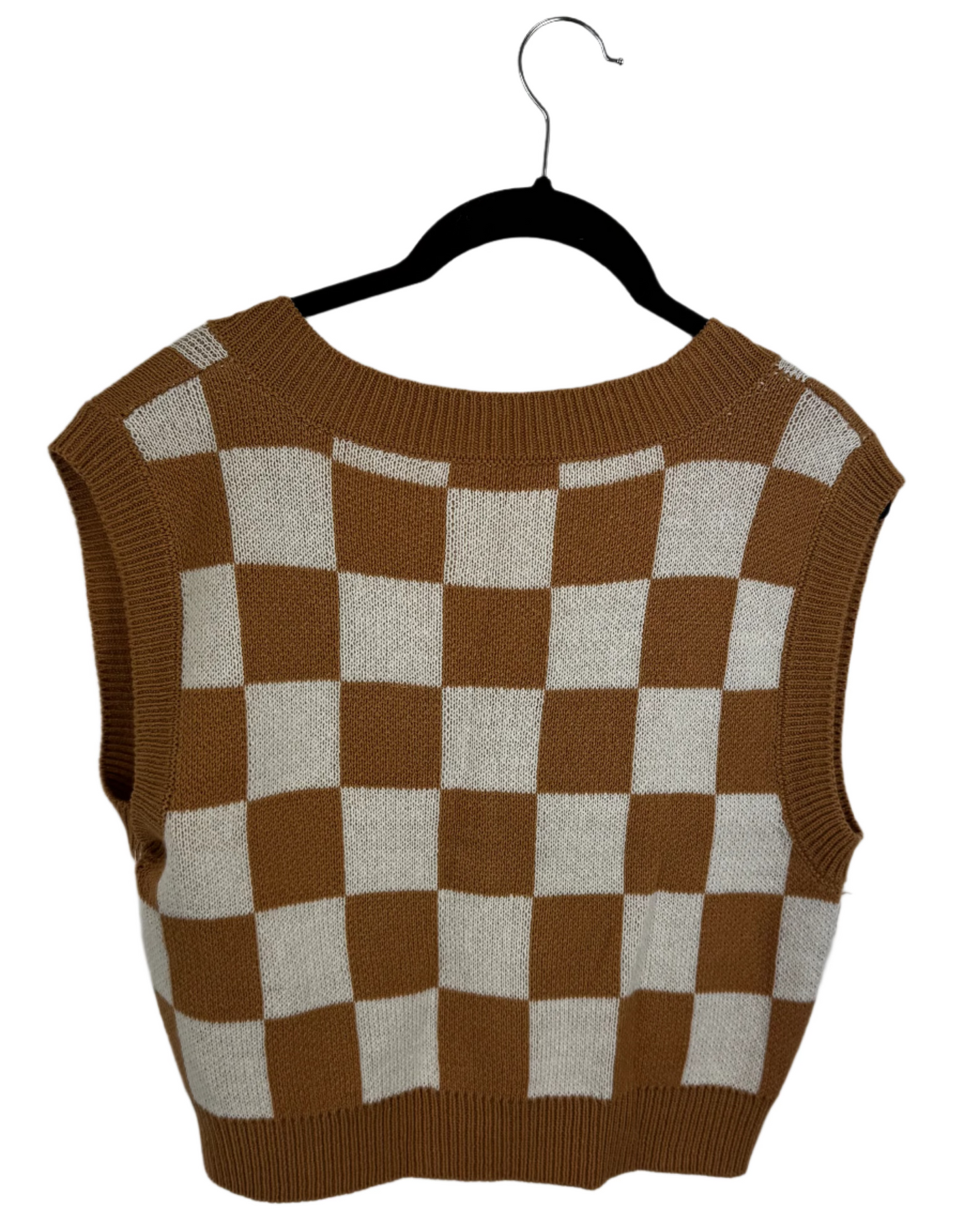 Tan cropped sweater vest, with a tan and white checkerboard pattern, v neckline, sleeveless, in a light weight material