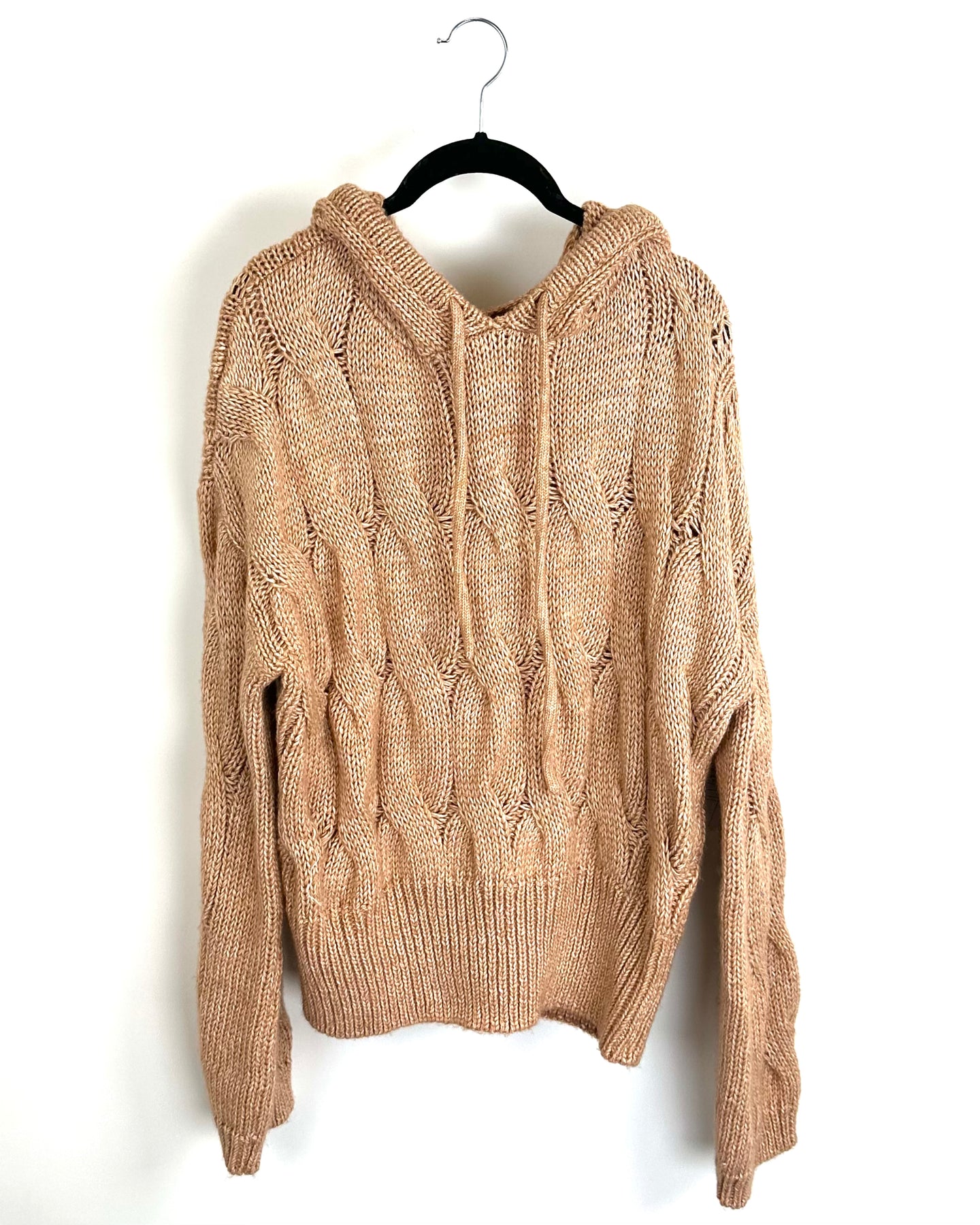 Tan/camel colored thick knit sweater with a hood and drawstrings
