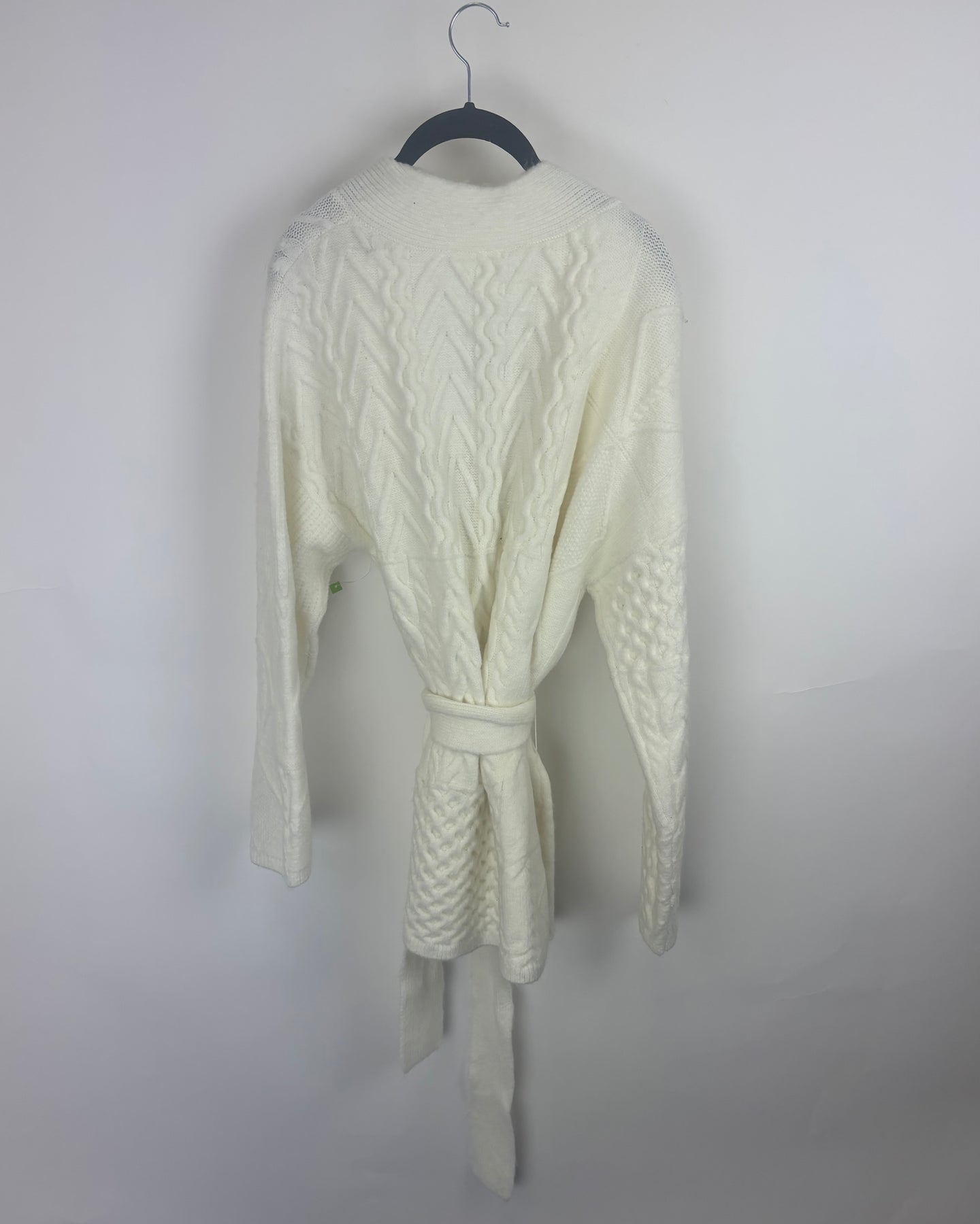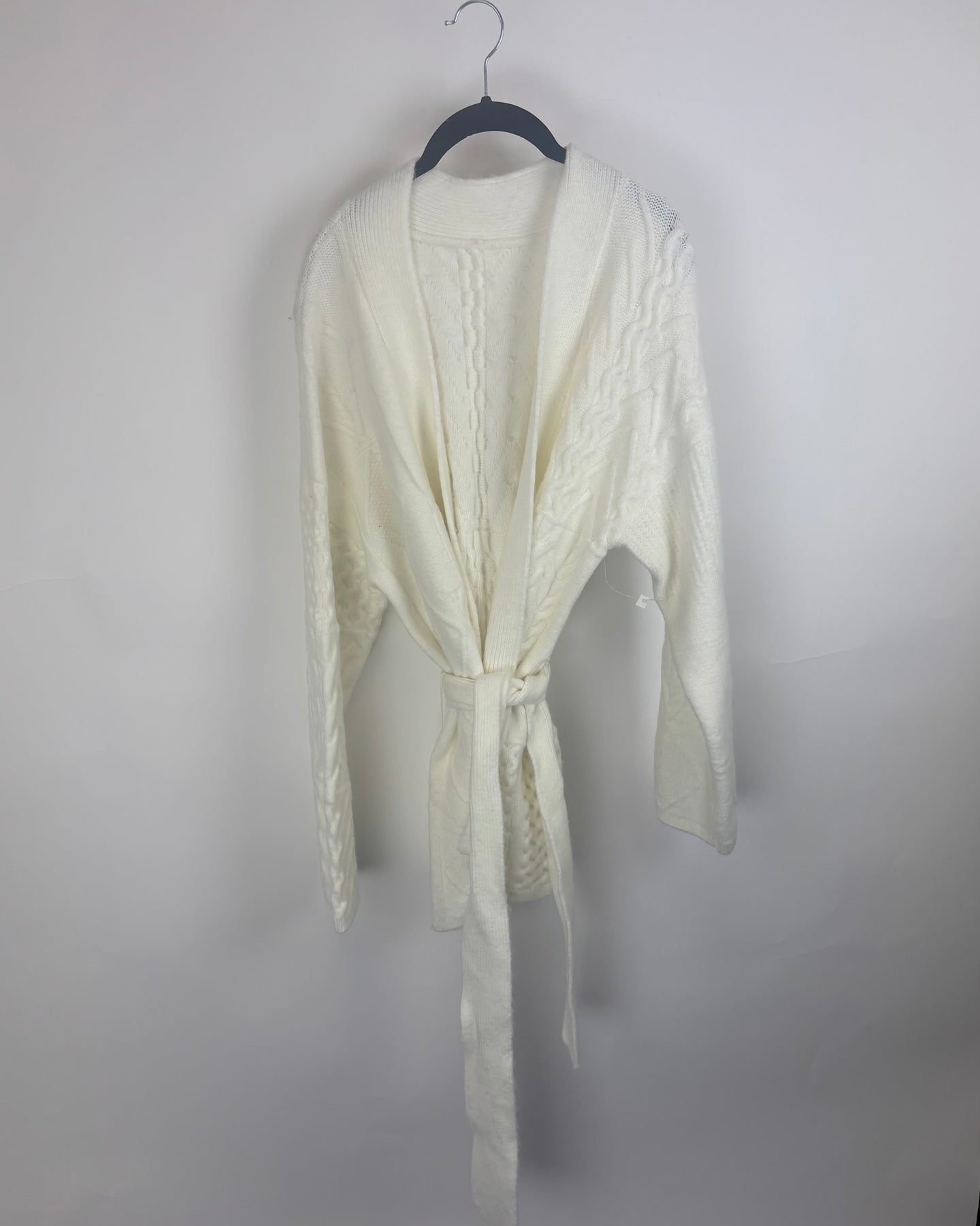 Thick white textured knit cardigan with long sleeves, open front and adjustable and removable tie belt in a thick and fuzzy knit fabric