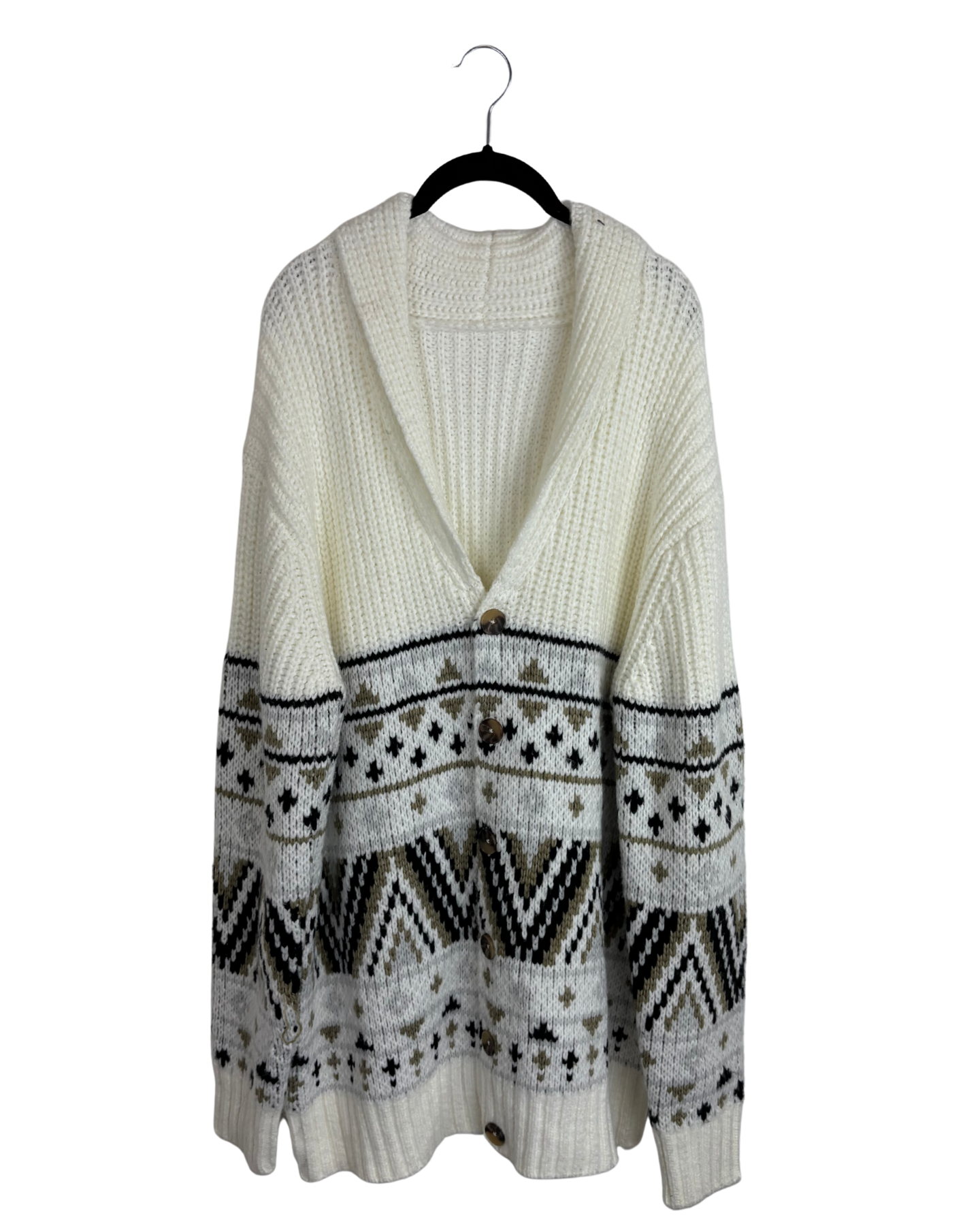 White cardigan sweater, oversized fit with knit fabric with black, grey, and taupe multi pattern, v-neckline with fold over collar, tortoise shell brown button-up front closure, long sleeves with ribbed cuffs and neckline