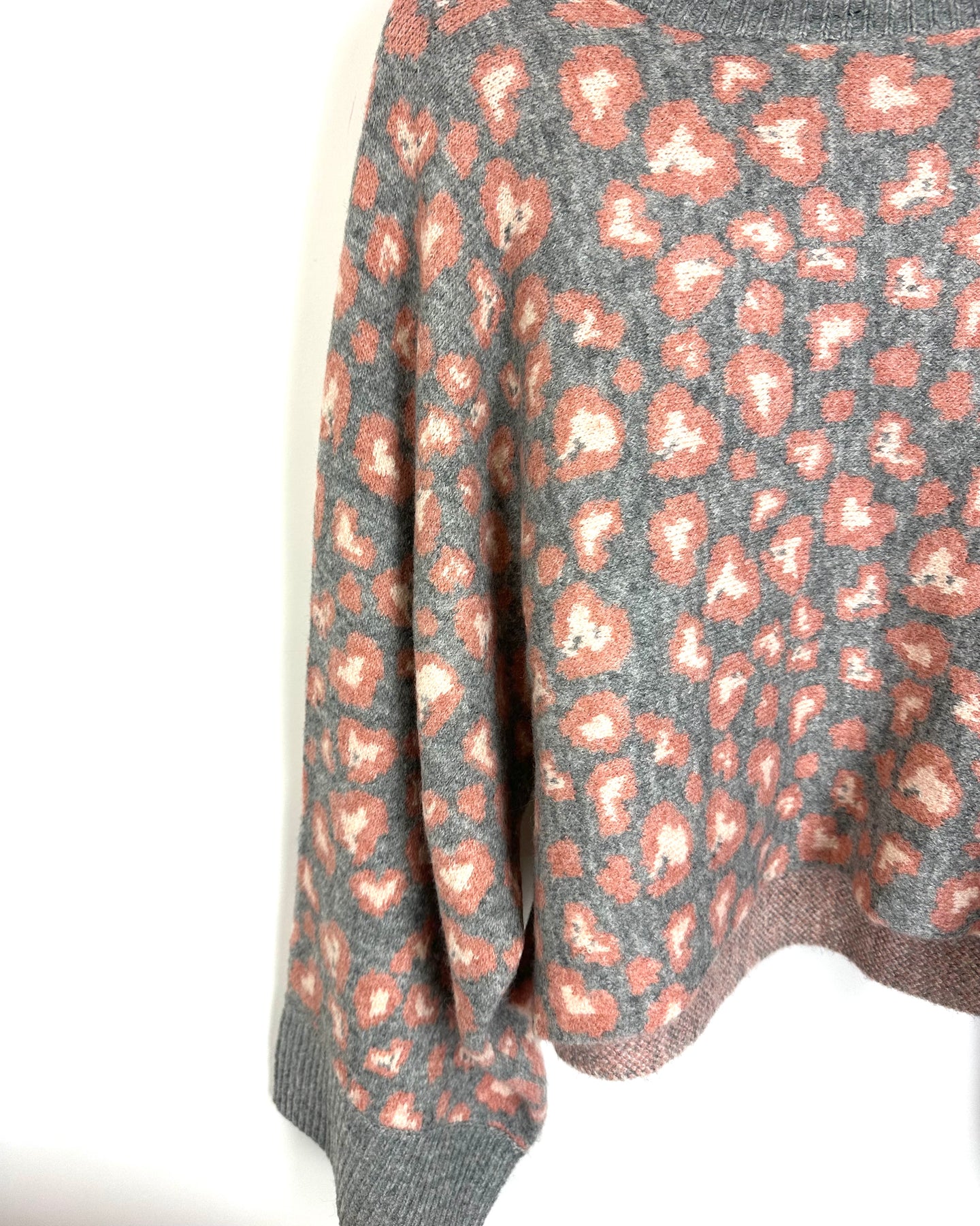 Reunited grey, wide long-sleeve, boatneck, cropped sweater with coral pink flower details