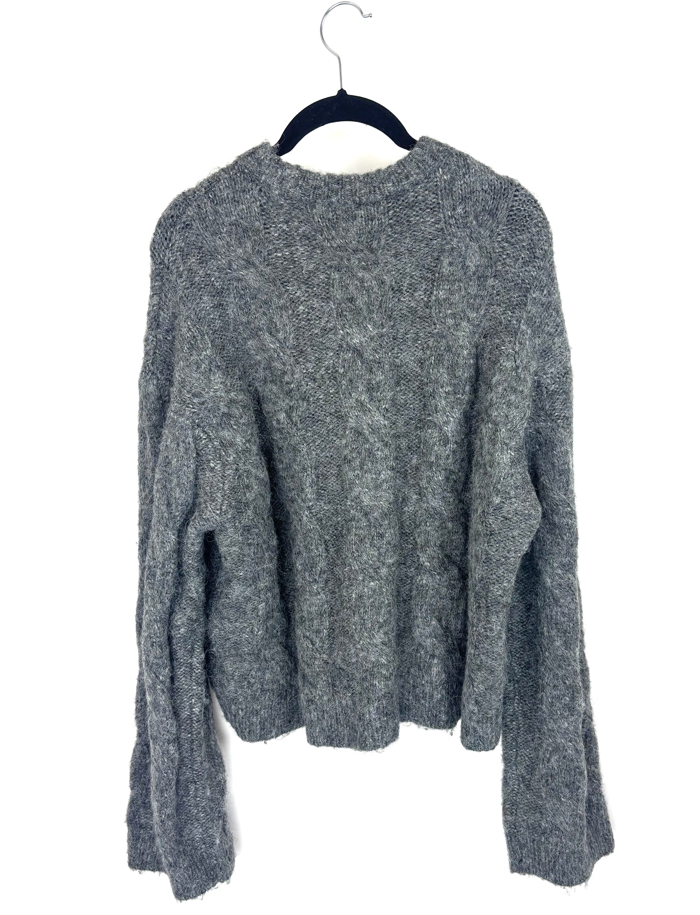 L'Academie fuzzy grey cable knit sweater with a crew neckline and long sleeves