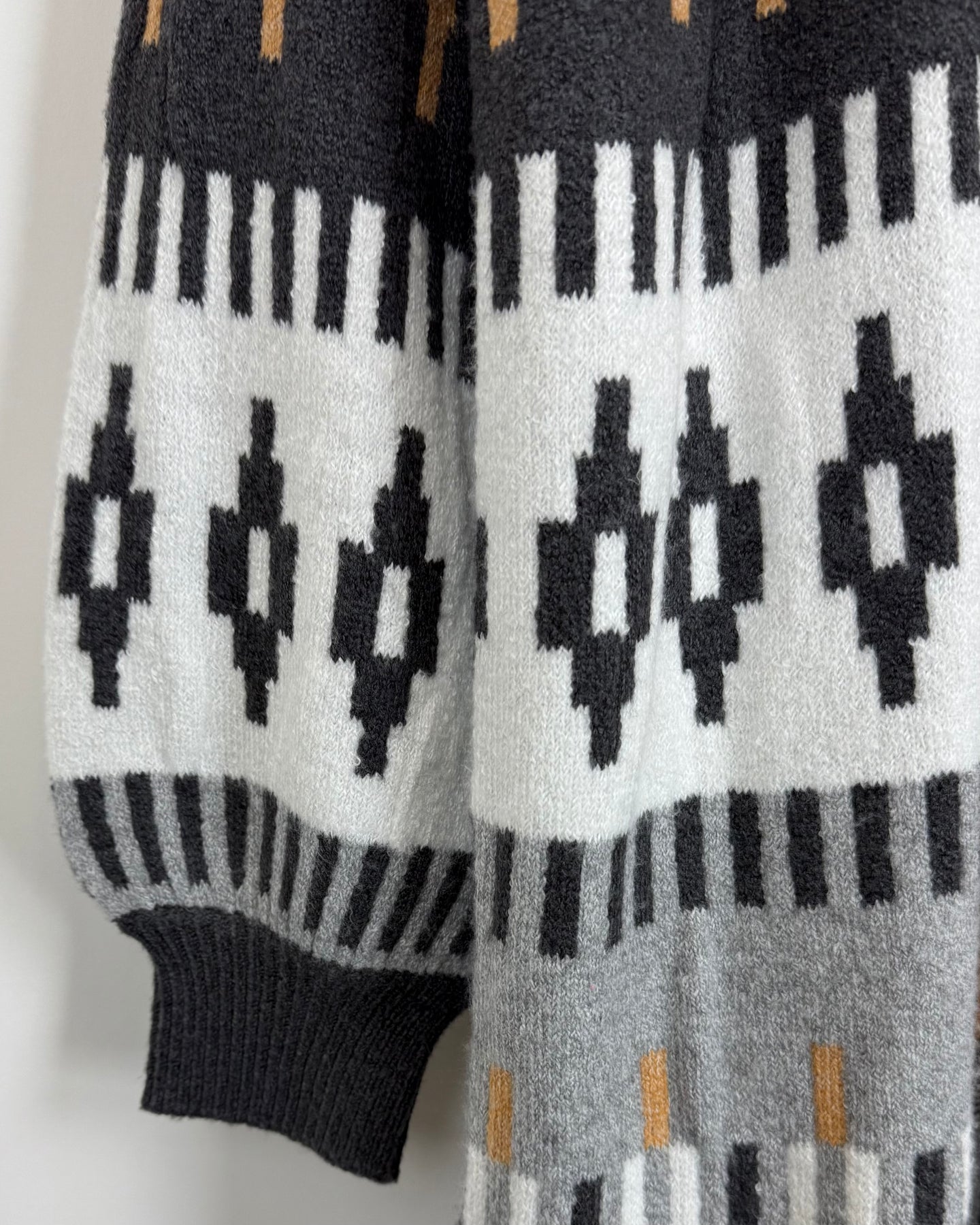Reunited grey, black, orange pattern cardigan, no button opening, very cozy, and lightweight