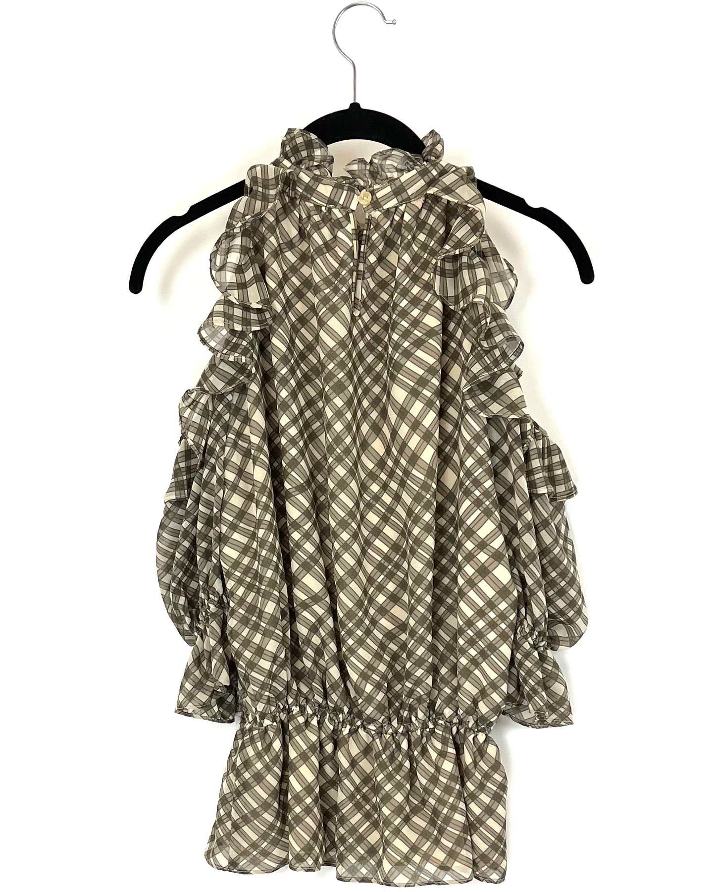 Max Studio brown and tan abstract printed top with quarter length sleeves with a shoulder cut out, high neckline, peplum bottom and ruffle details