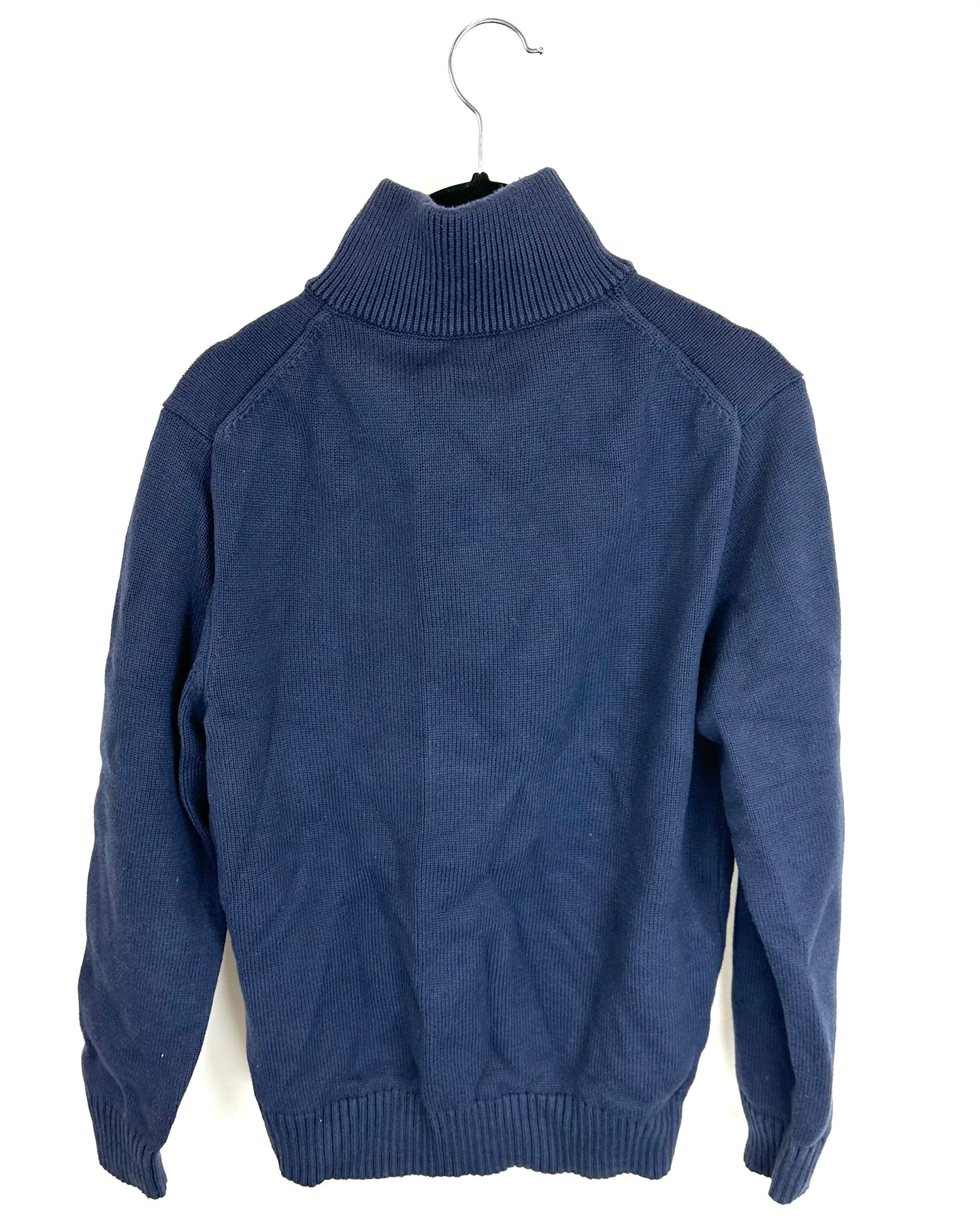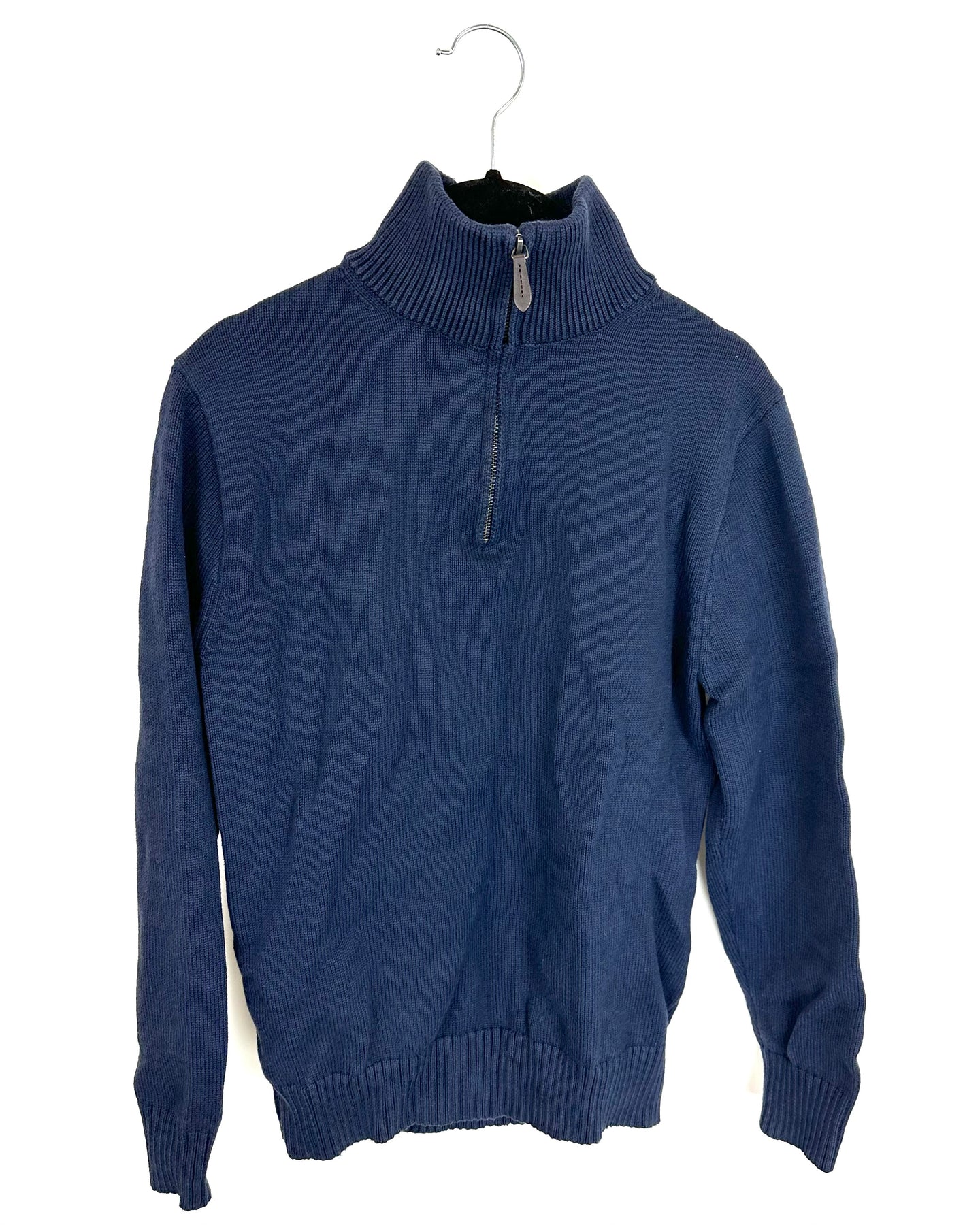J Crew navy blue sweater, heavyweight knit material with high neck, dark grey half-zip closure with brown zipper, long sleeves and ribbed trim detailing on neckline, cuffs, and hemline
