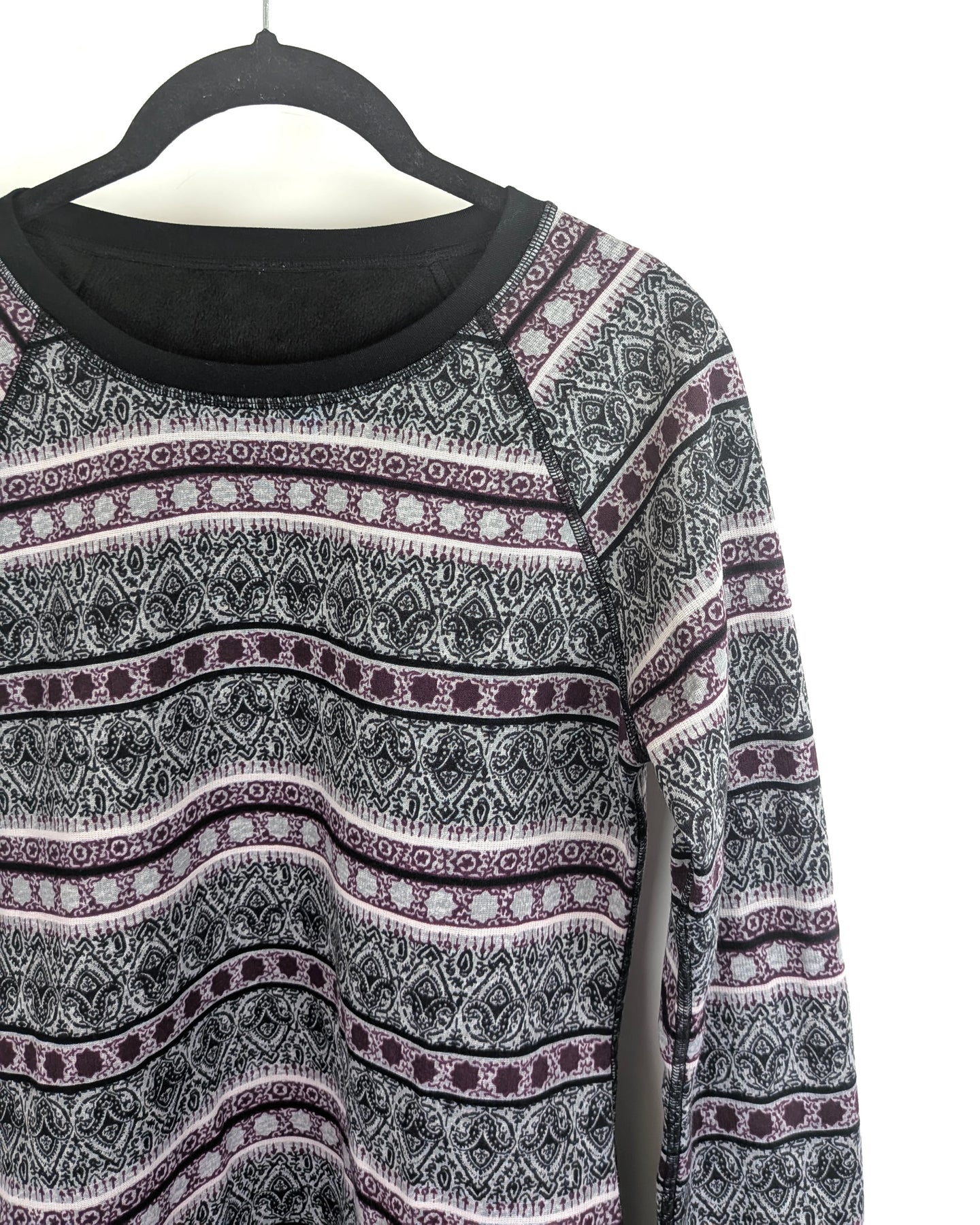 Cuddl Duds long sleeve fleecewear patterned knit pullover with ribbed black trim at the cuffs, collar, black hem, slim fit, and cozy texture