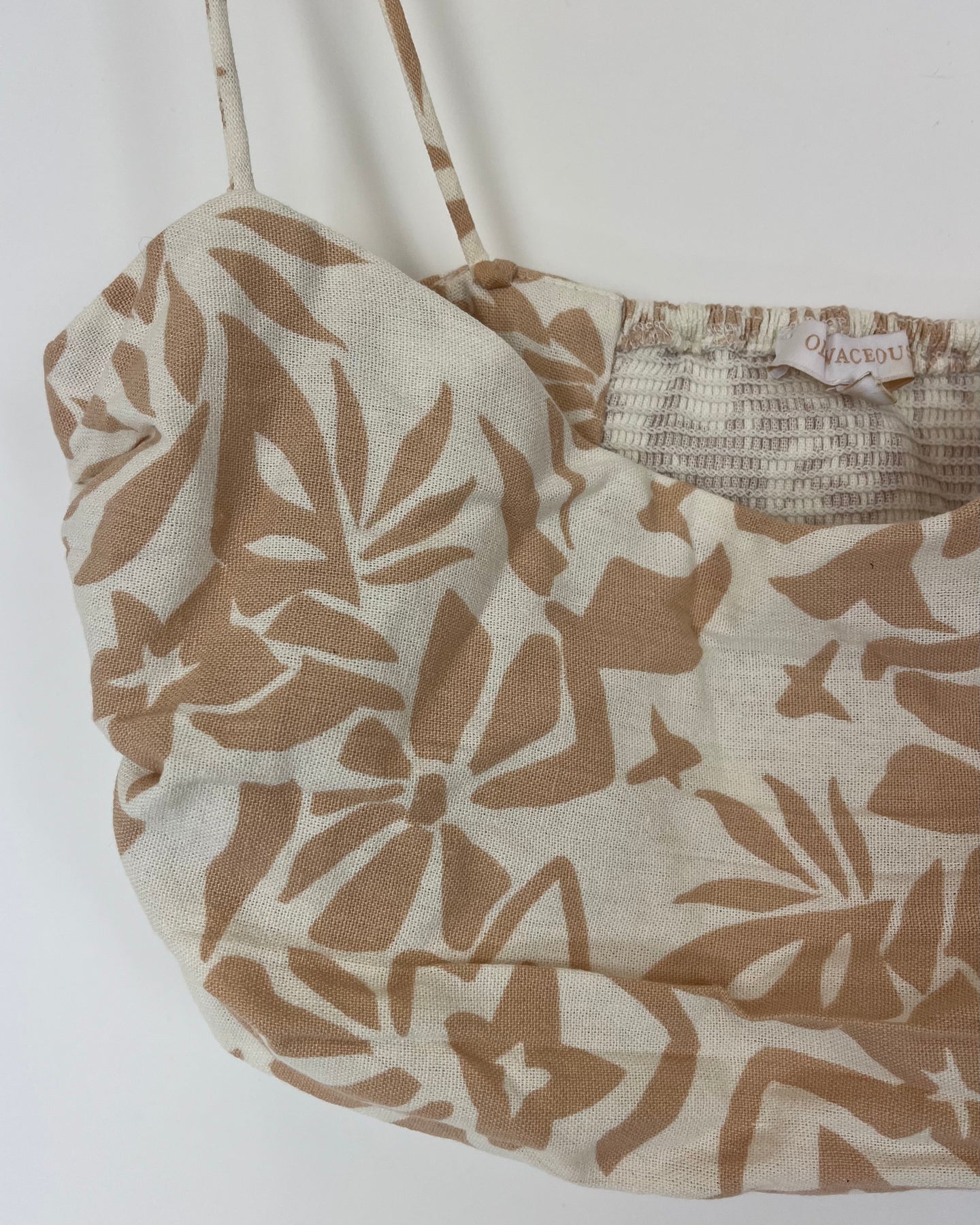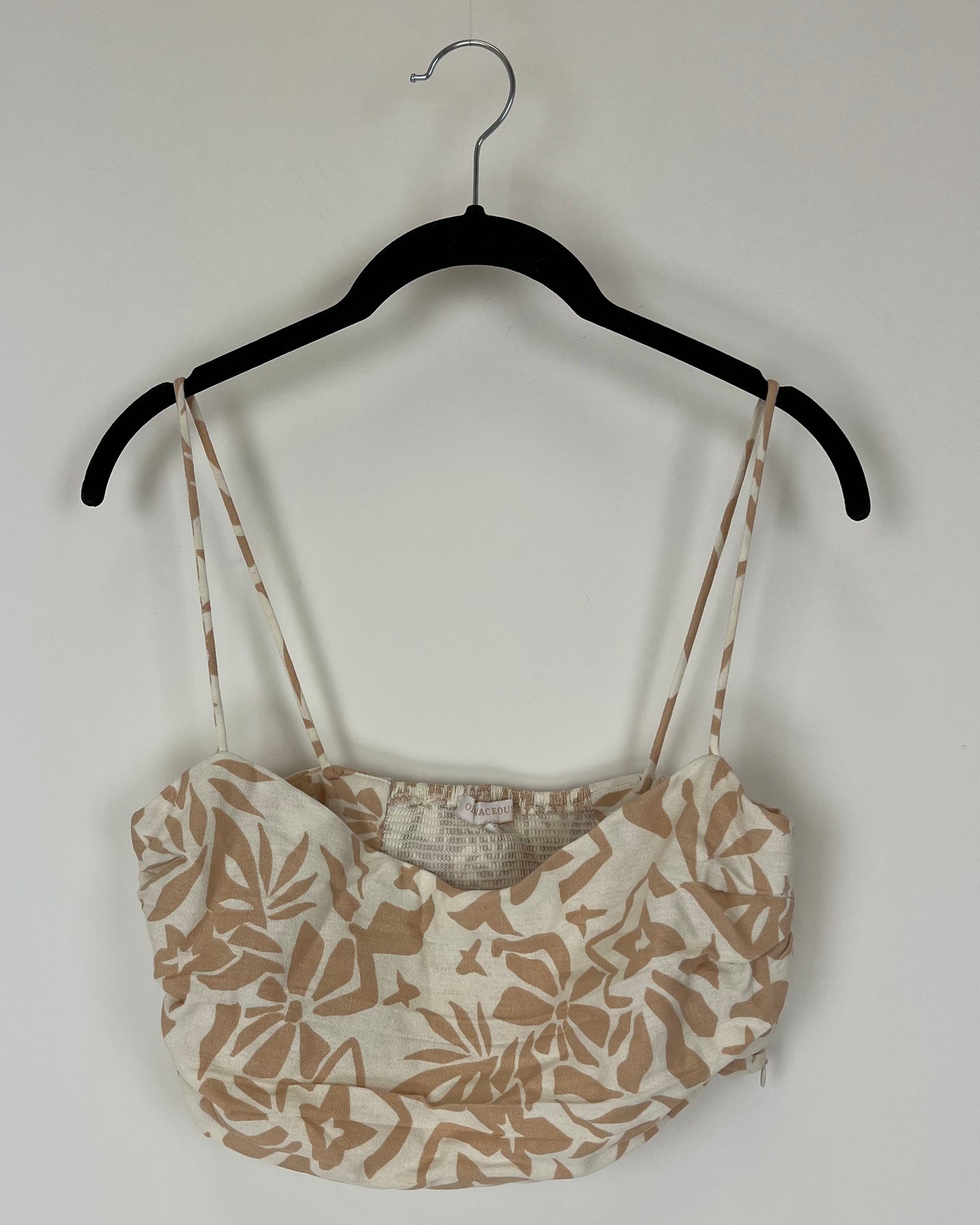 Oliviaceous white and tan cropped linen top with abstract floral print, smocked back and side zipper closure