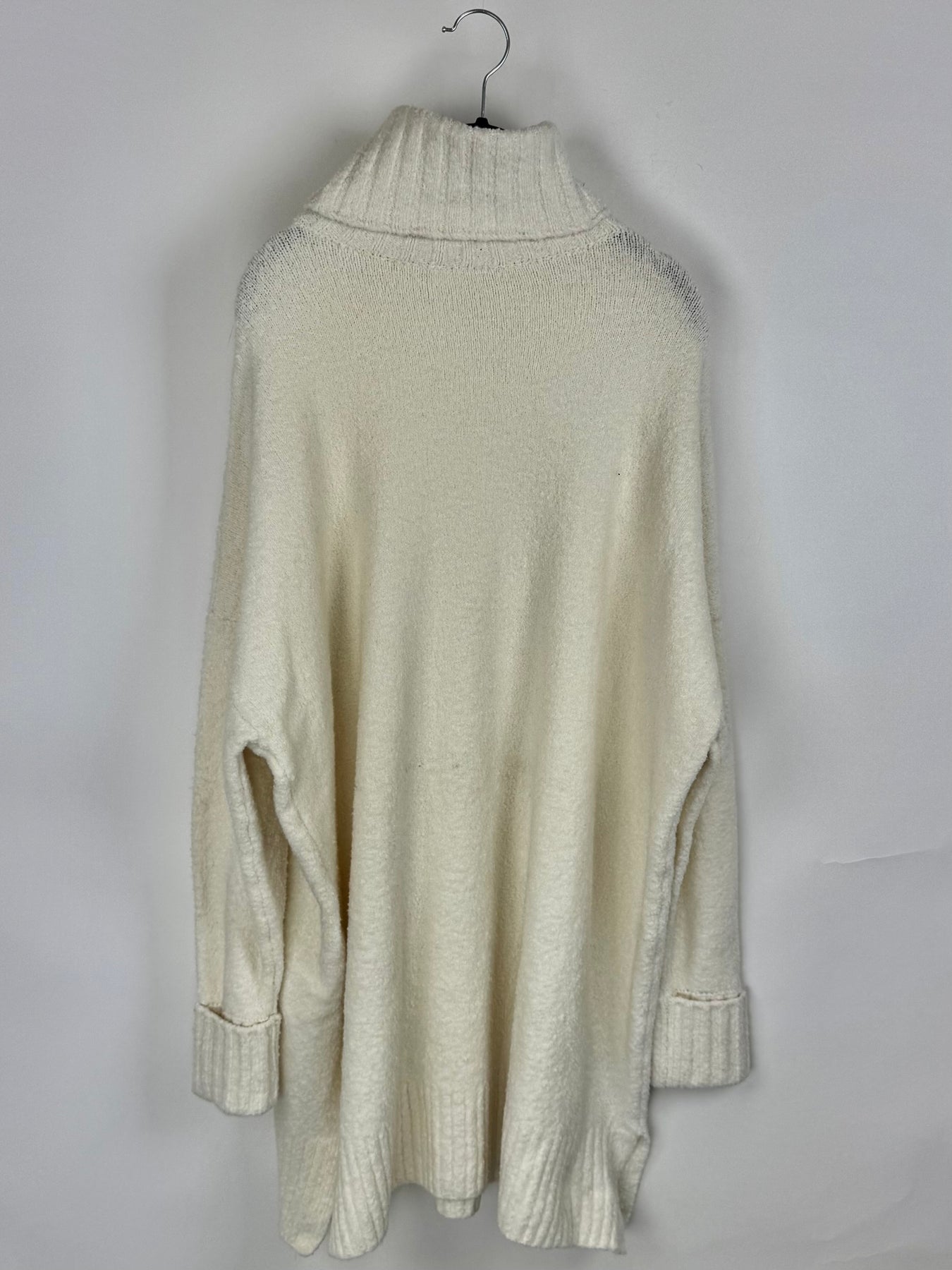 Off-White soft knit long-sleeve sweater with a foldover turtleneck, foldover cuffs, and contrasting hems
