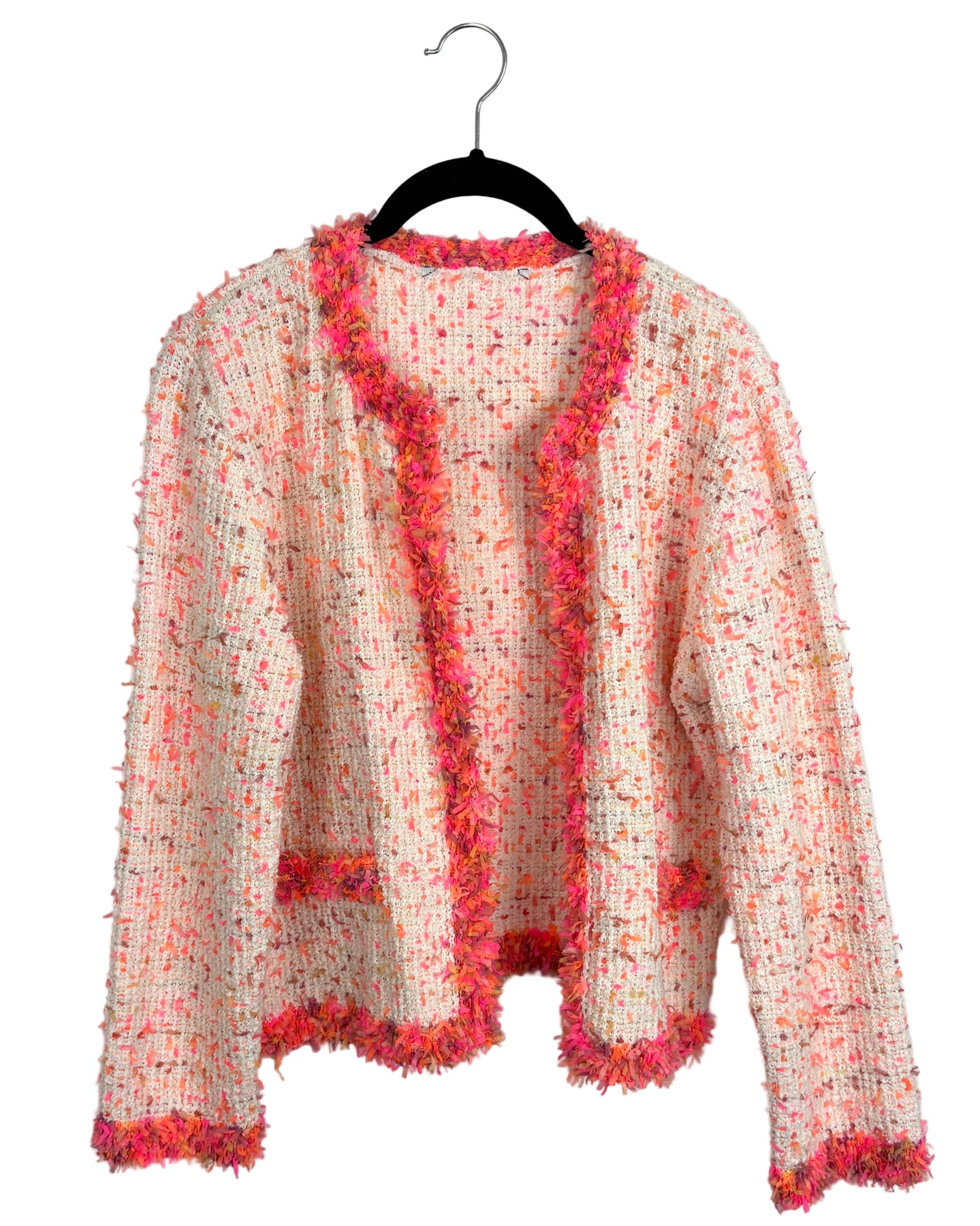 Cream color tweed cardigan with pink & orange confetti-like accents, long sleeves, faux pockets and open draped front