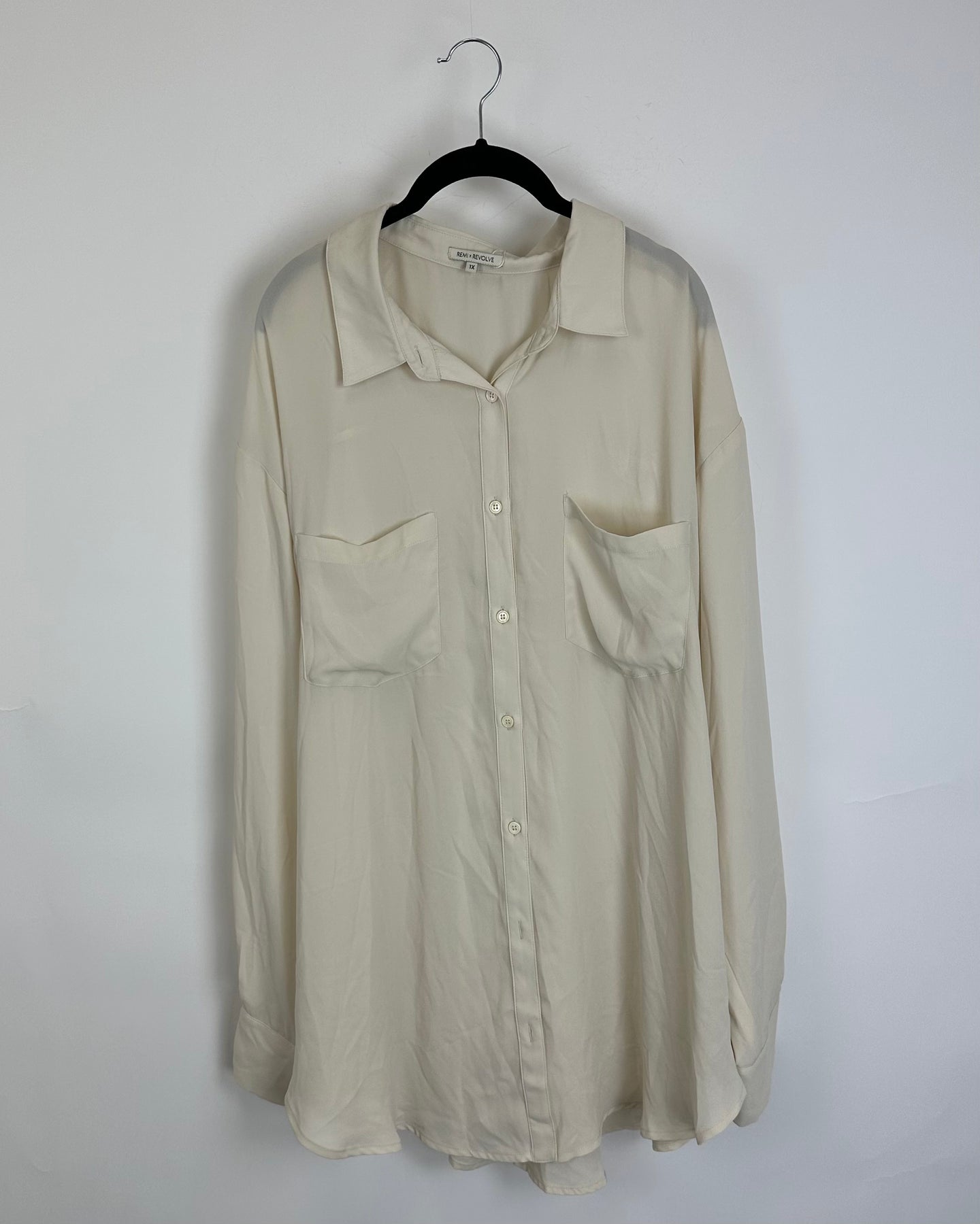 Remi X Revolve cream button-up top in a slightly see-through material with a collar neckline, two front pockets, long sleeves, and two buttons on each arm cuff