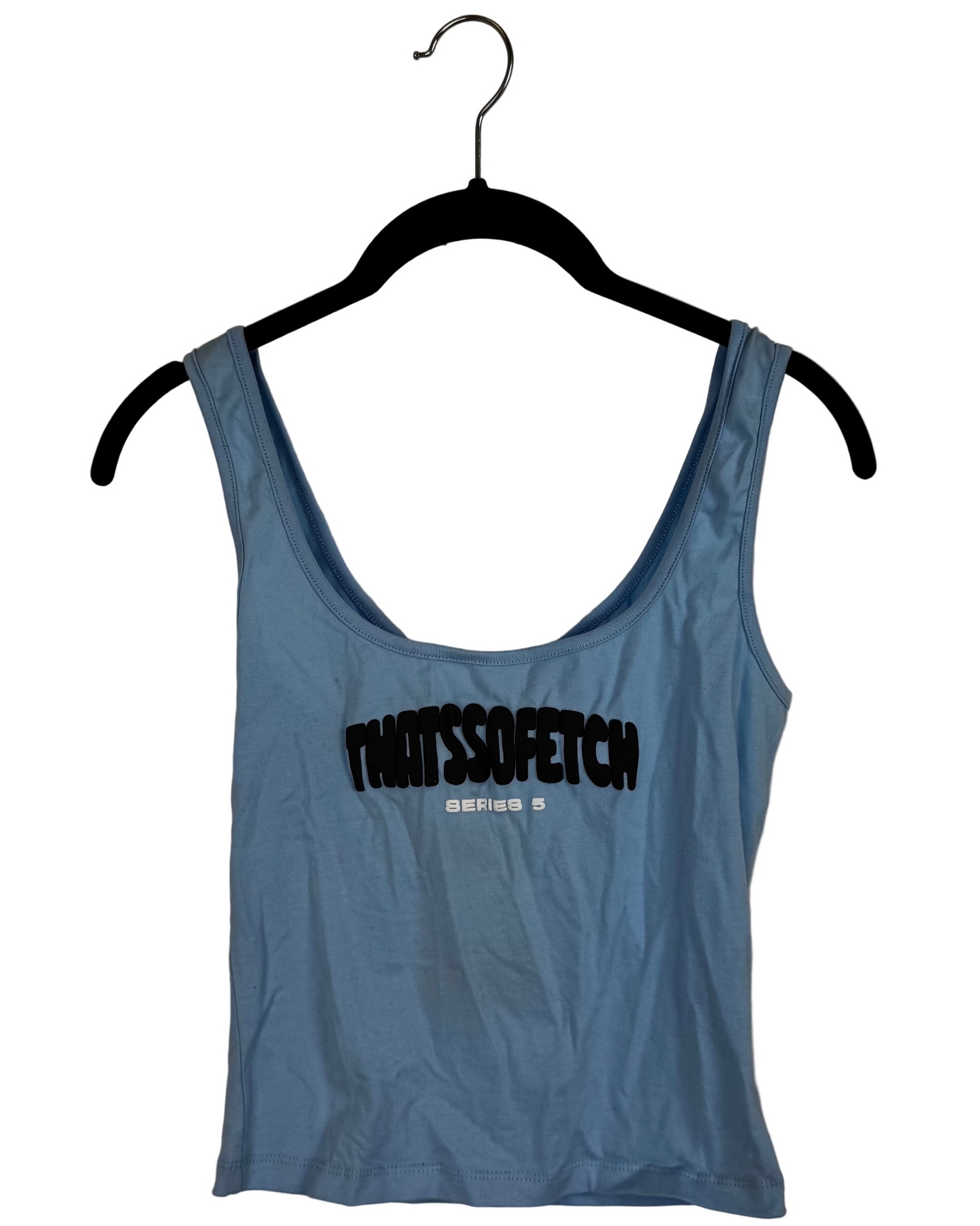 Thats So Fetch light blue cropped tank top with "Thats so Fetch" in bubble textured gray writing and "series 5" in white writing across the chest