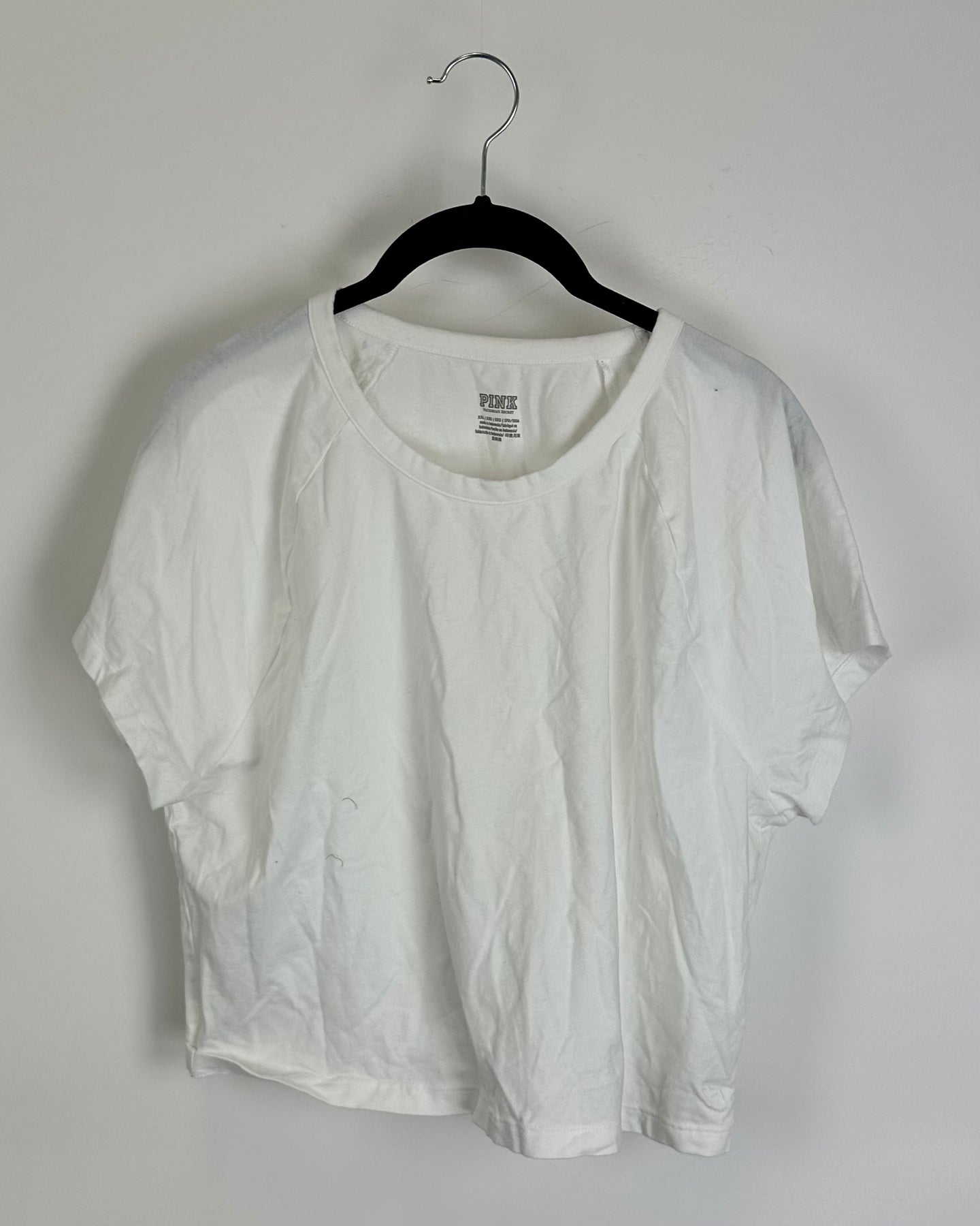 Victoria's Secret PINK white top, lightweight stretch knit material fabric with crew neckline, raglan-style short sleeves and slight cropped length