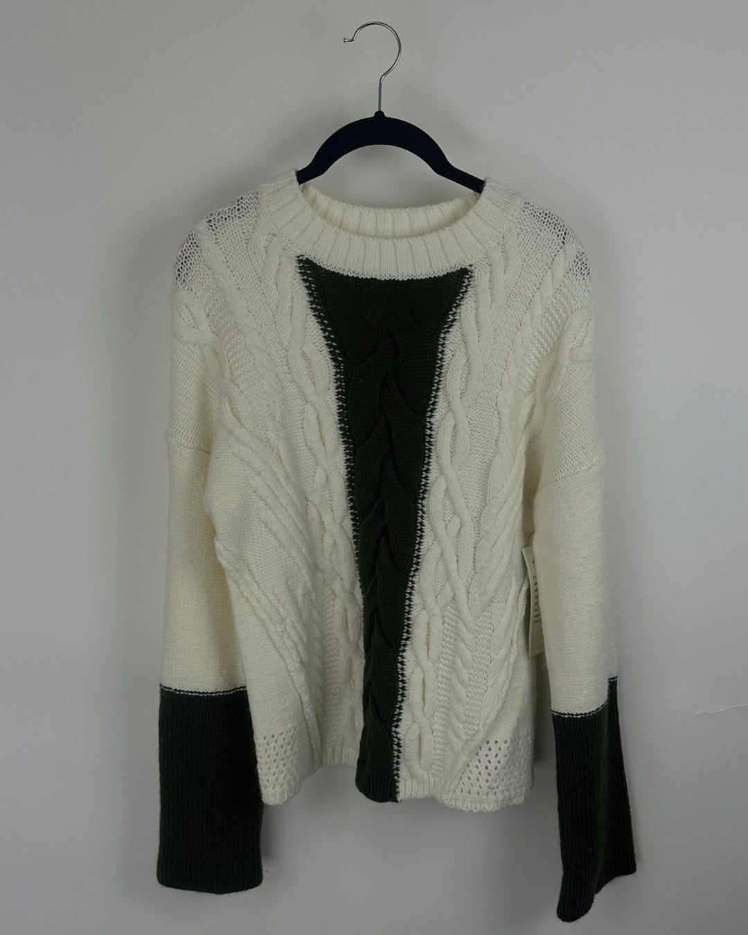 Army Green & White Knit Cable Sweater - Small