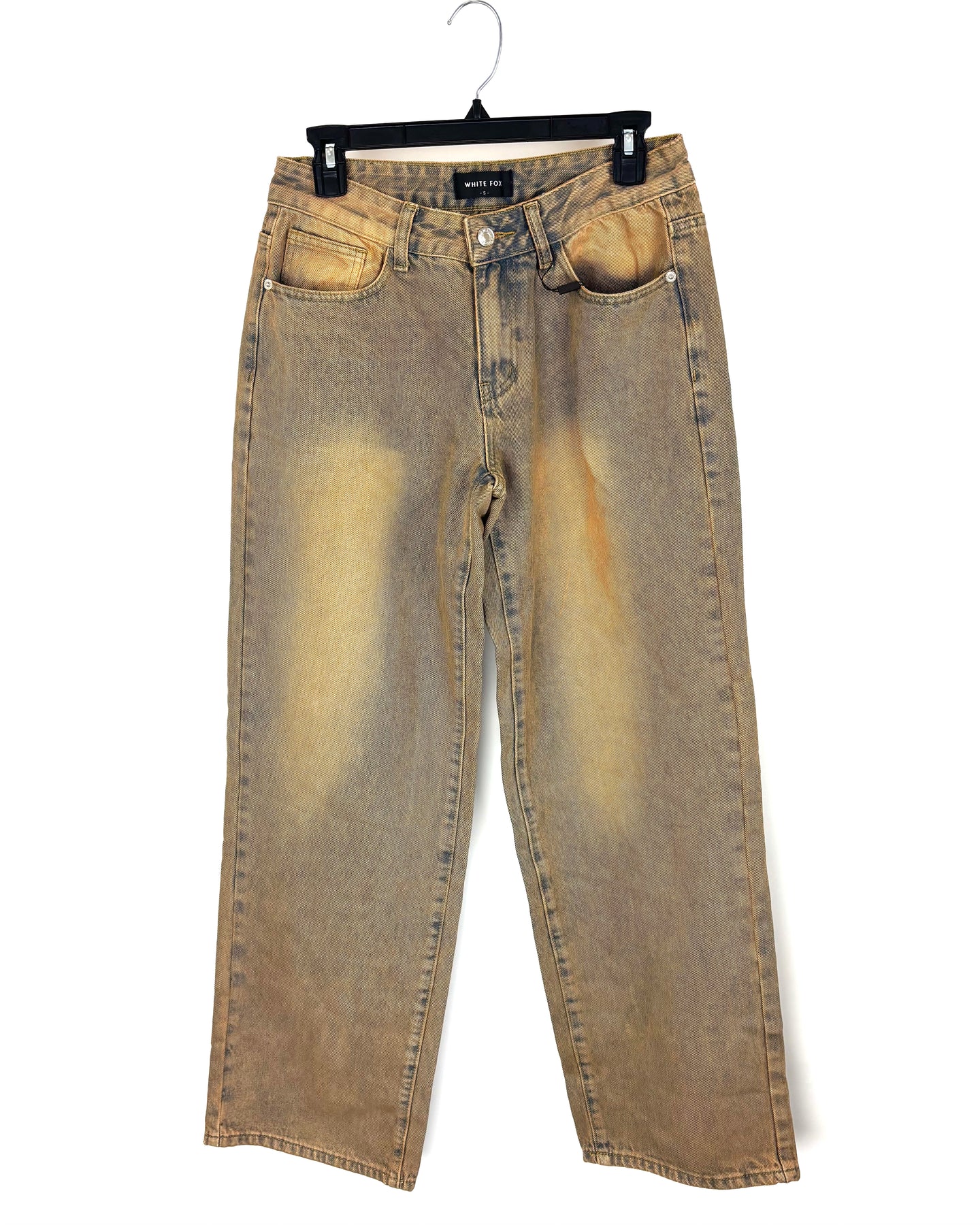 White Fox brown acid wash wide leg jeans with a low rise waist, belt loops, pockets, and front zipper and button closure