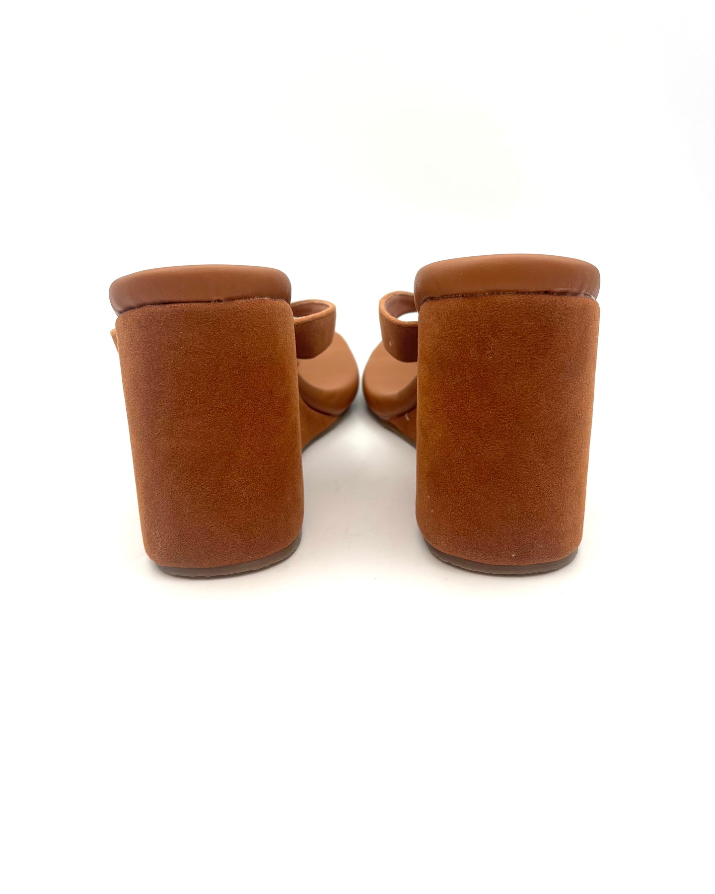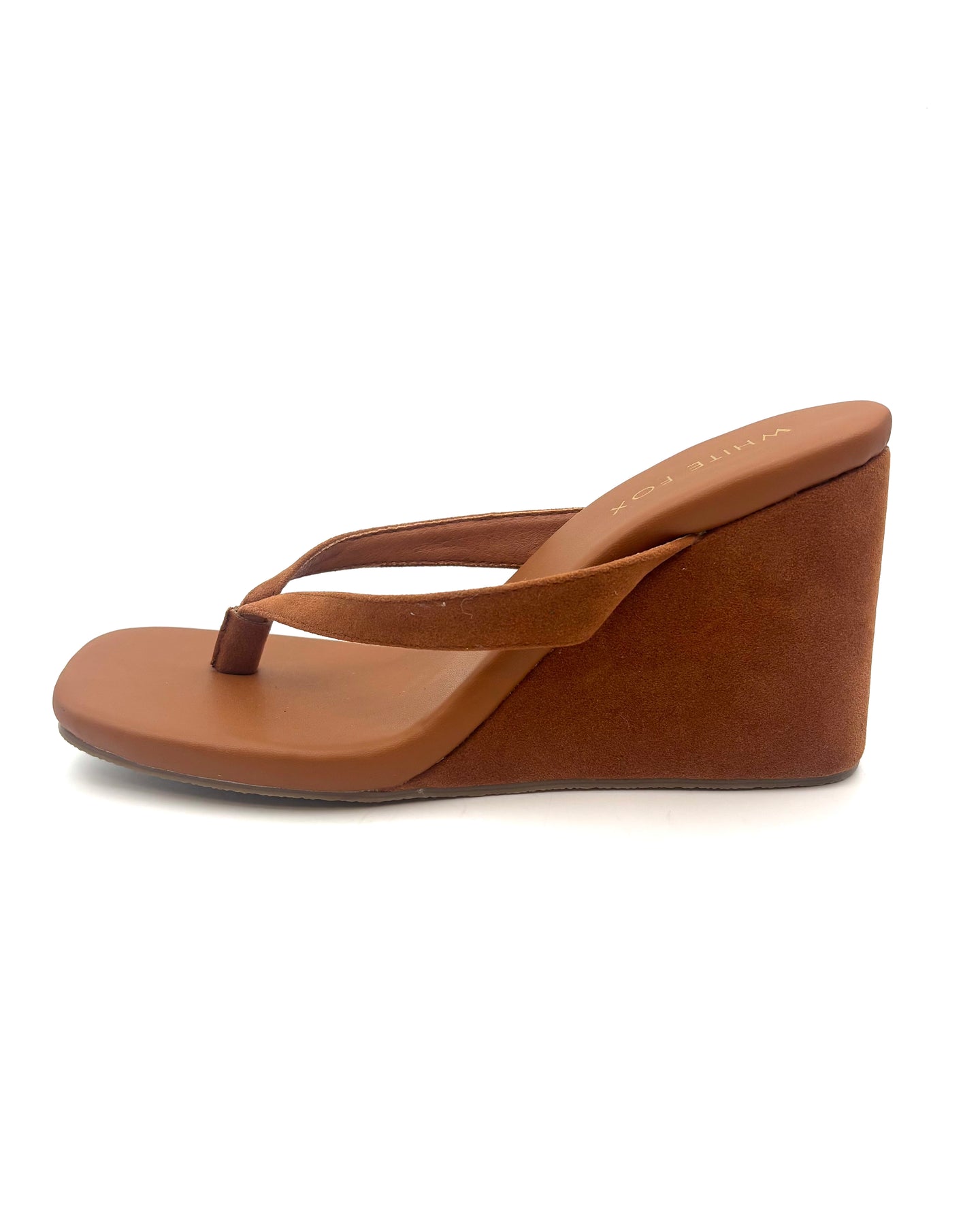 White Fox brown faux leather wedge sandal with a faux suede detailing and open round toe