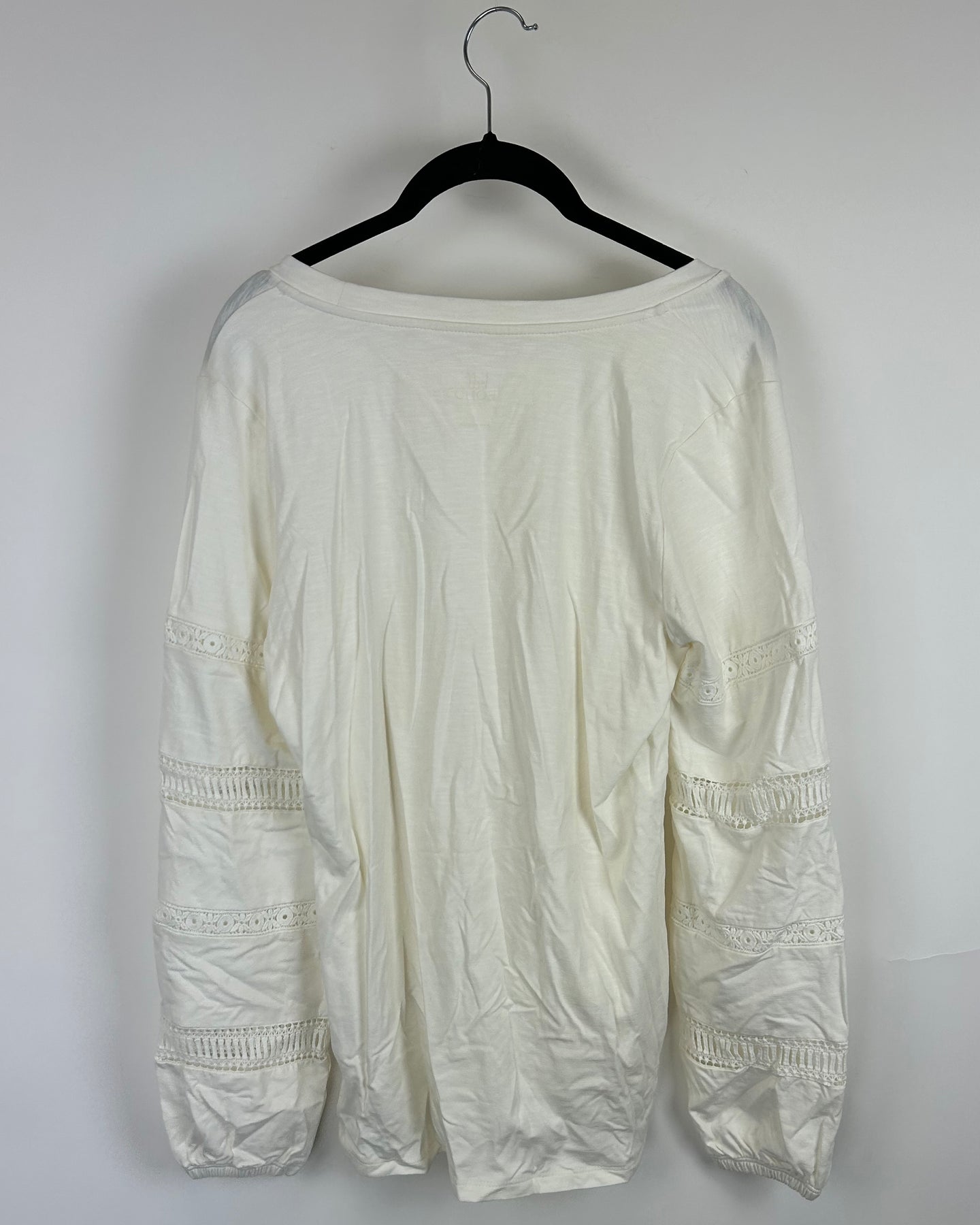 Belle by Kim Gravel white long sleeve top with lace cutouts on sleeves, elastic cuffs, and bottom side slits