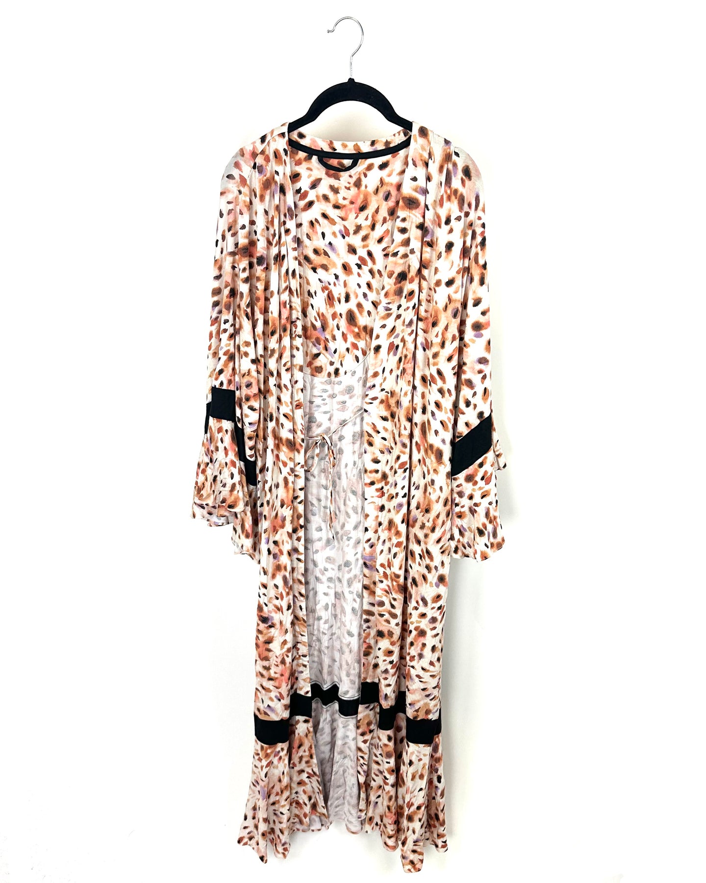 Animal print long robe with cropped flared sleeves, adjustable fabric tie waistband and two hand pockets in a soft and stretchy fabric