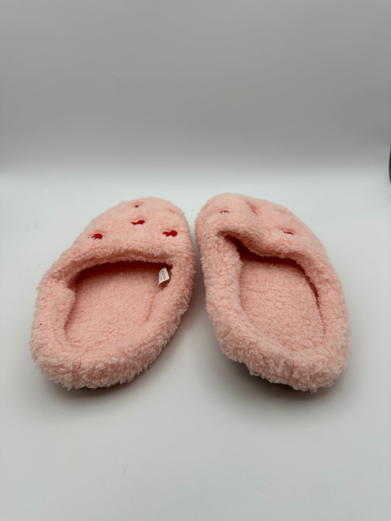 Baby pink slippers, soft fluffy material with rounded closed toe and embroidered red heart design, with tan soft bottom sole