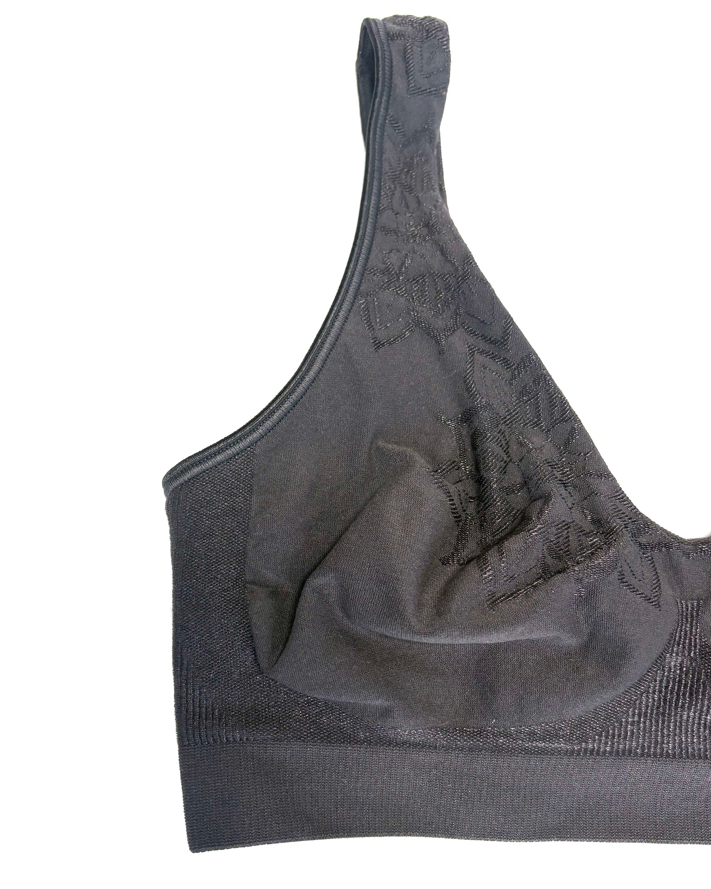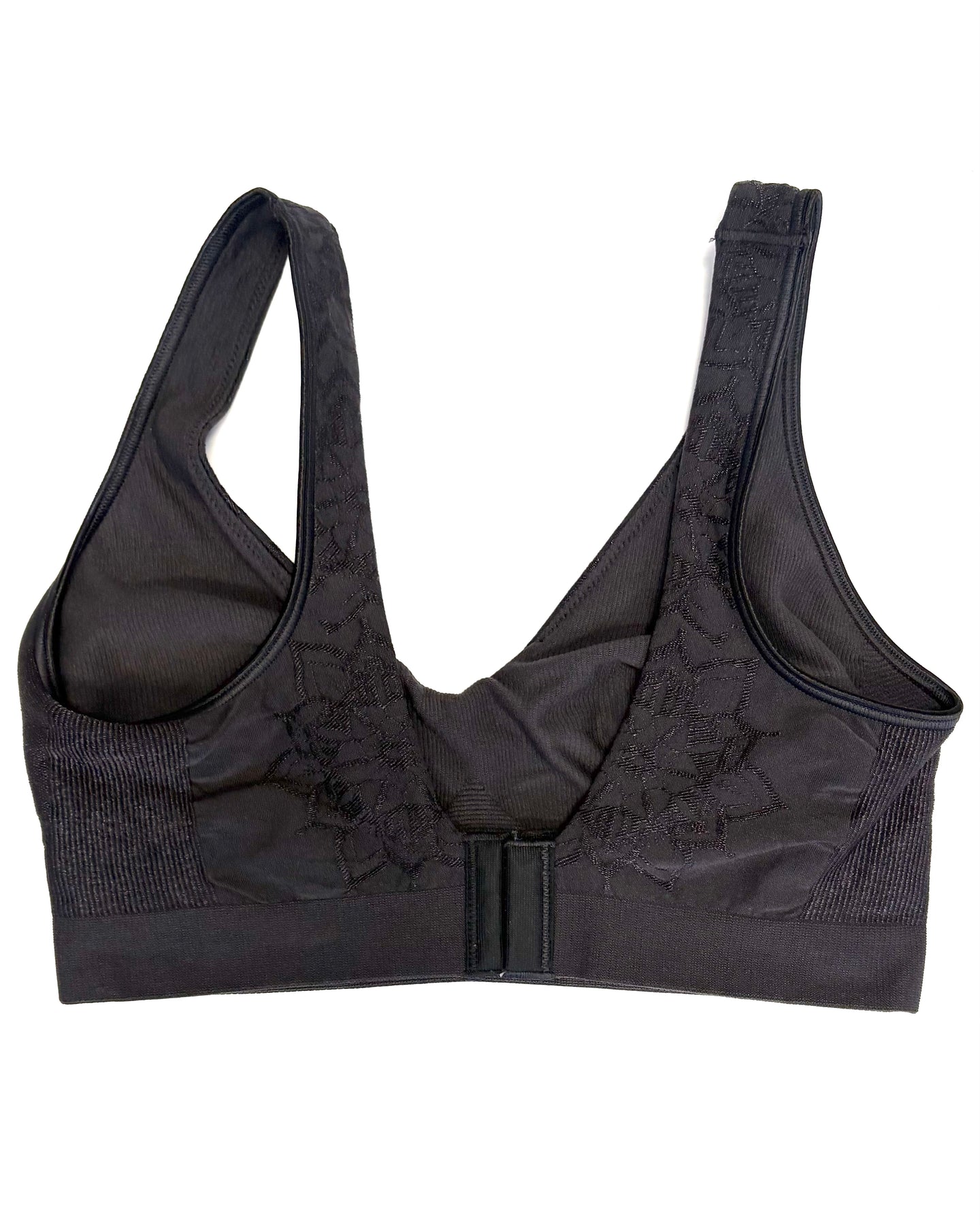 Black sports bra with flowers on cup and straps, ribbed detailing on sides, elastic stretch band, no padding, deep V front and back cut , provides moderate support, comfortable, stretchy and soft