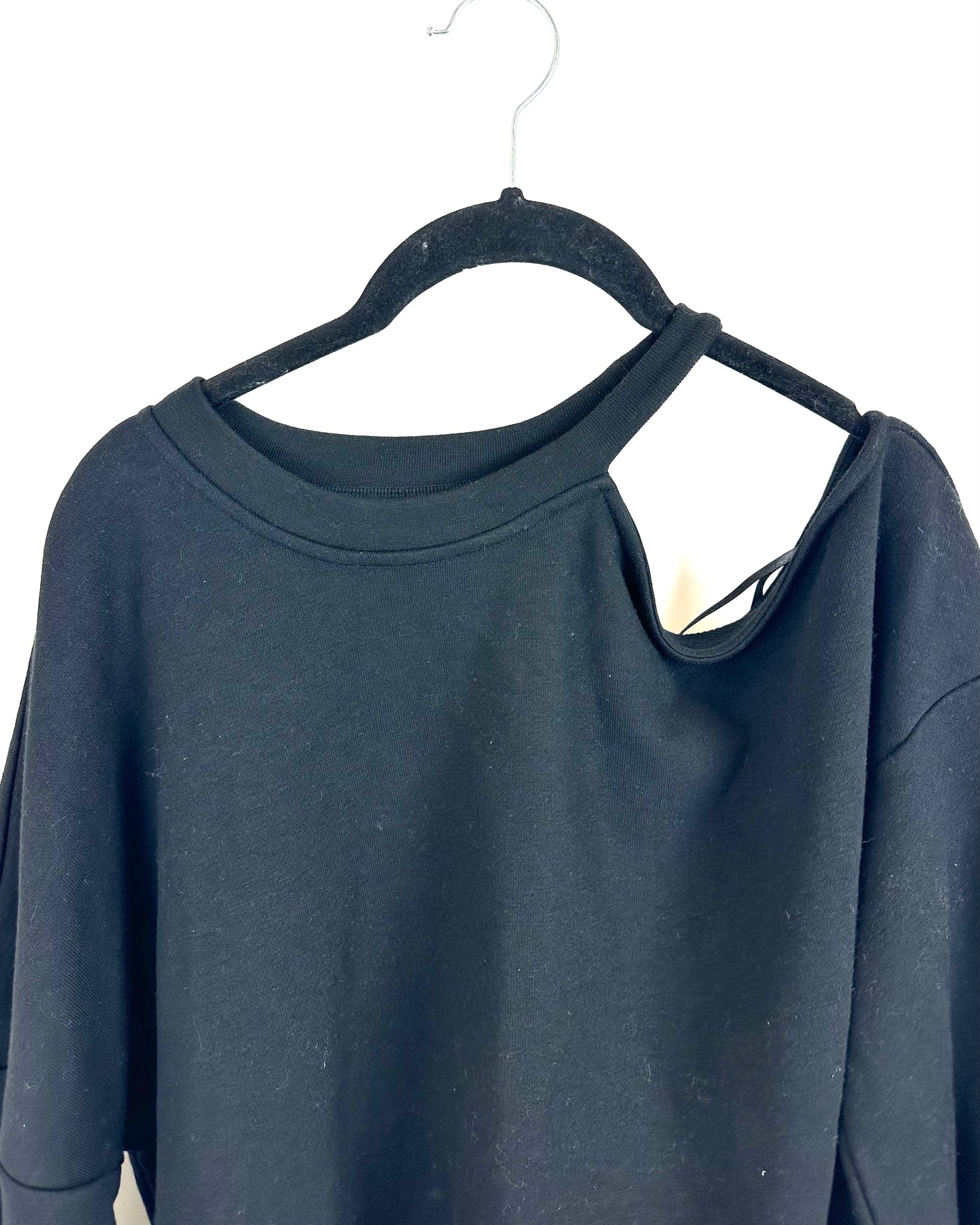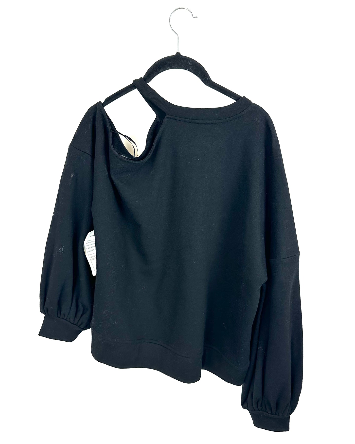 Reunited Clothing, Black long sleeve sweater with one shoulder design and ruched sleeve detailing.