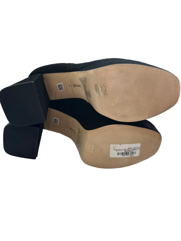 Larroudé black suede platform boots with a round toe, 4.5 inch thick heel, 1.5 inch platform and approximately 22" tall from the top of the boot to the bottom of the heel and pull up style. There is slight scuff marks on suede most likely from photoshoots but shoe is brand new.
