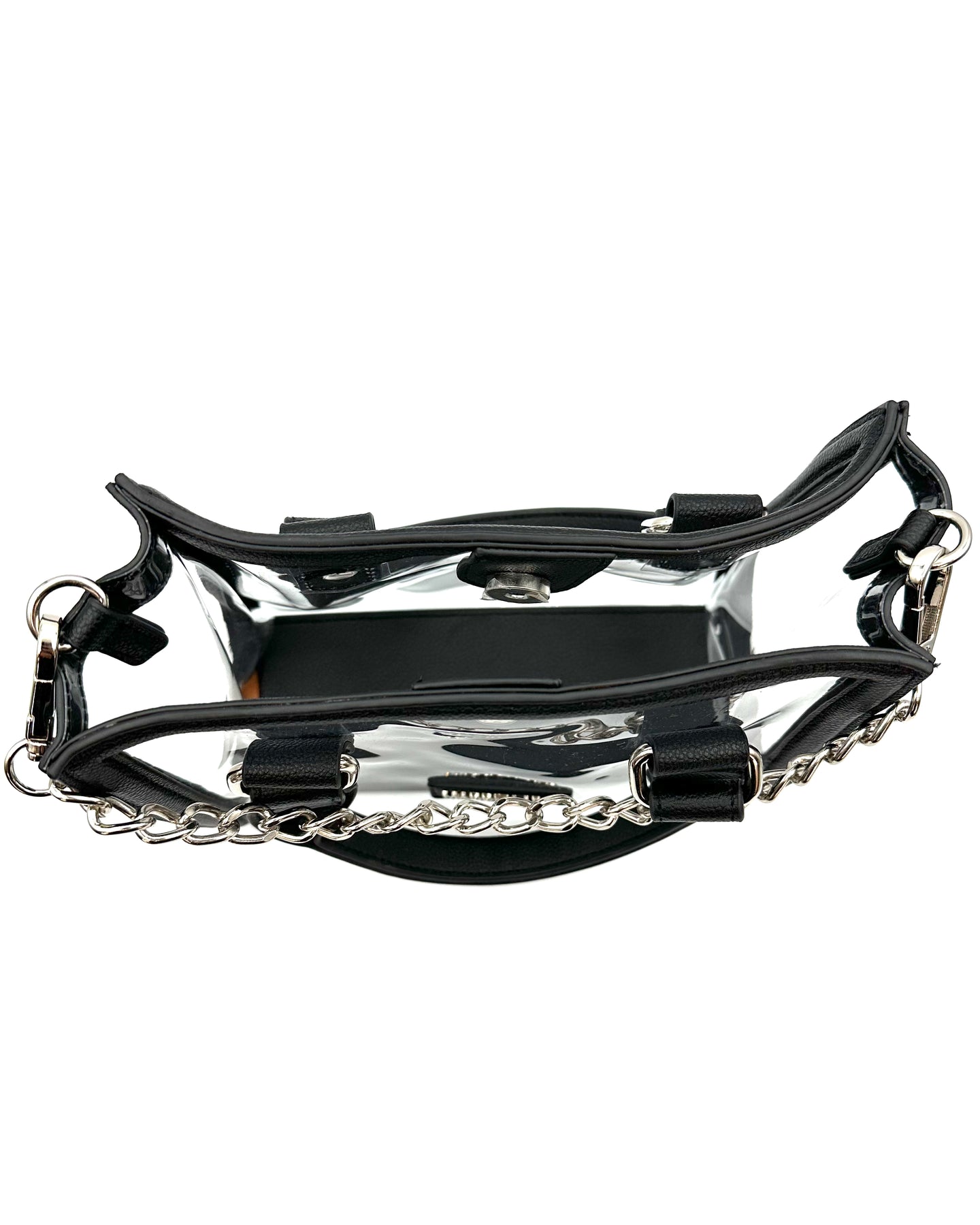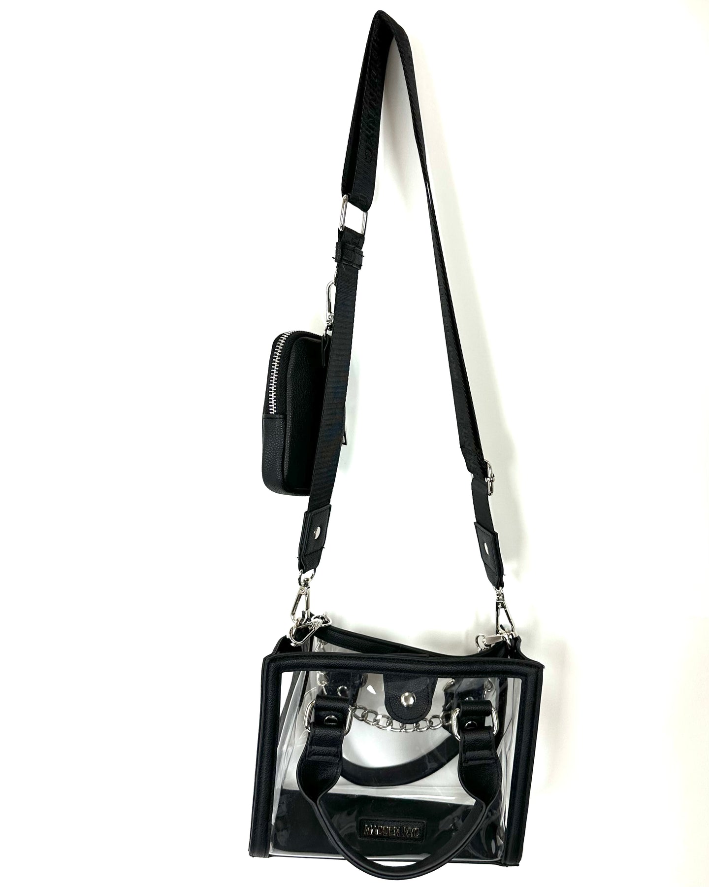 Madden NYC black and transparent tote style crossbody bag, transparent material with faux leather base and trim, silver hardware, magnetic snap closure, faux leather handles, removable and adjustable nylon shoulder strap, with removable black rhinestone coin purse and removable silver chain