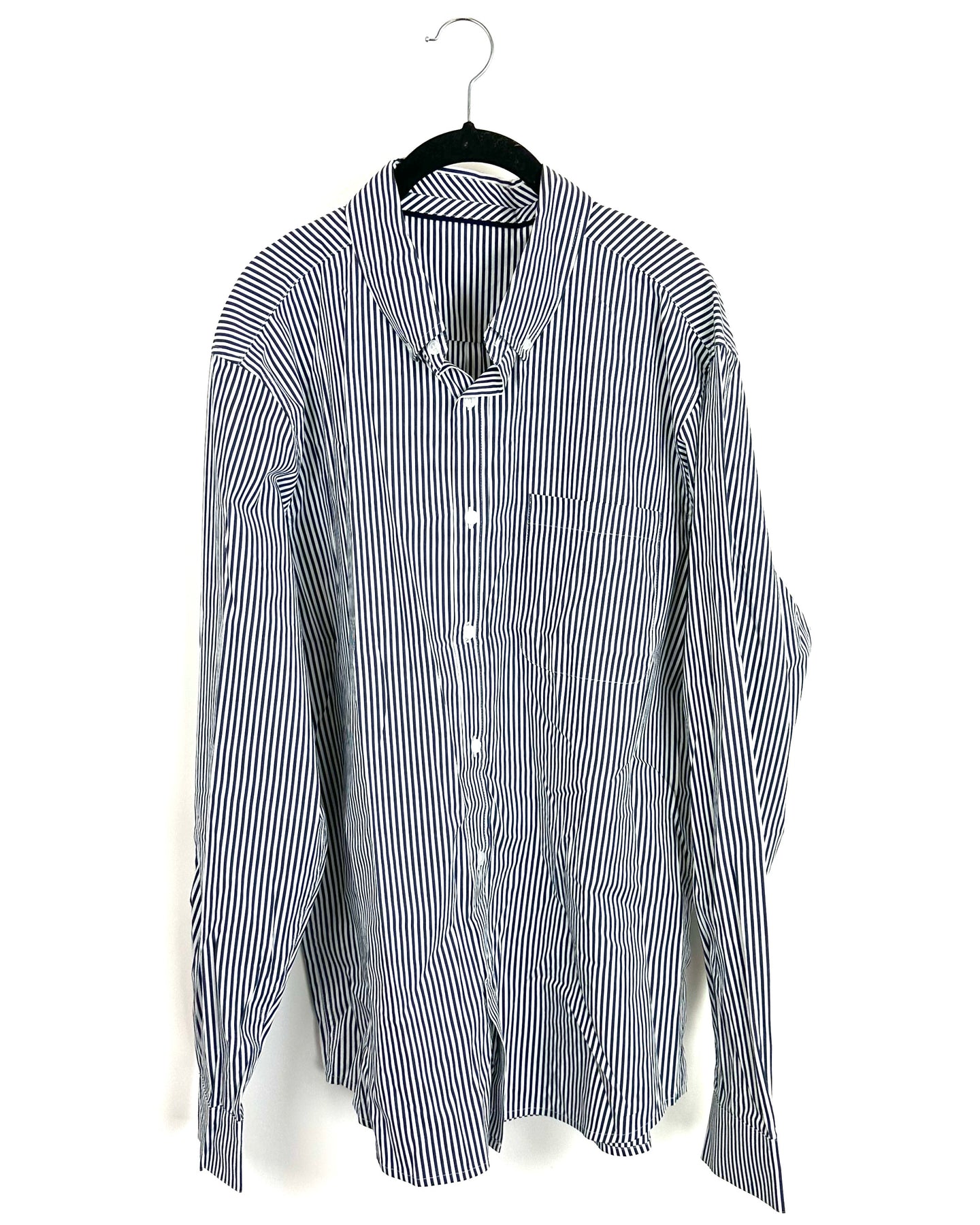 Reunited blue button down featuring vertical stripes and a front pocket design, collared neckline, long sleeves, and button cuffs
