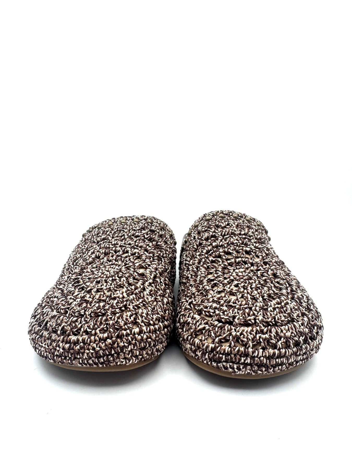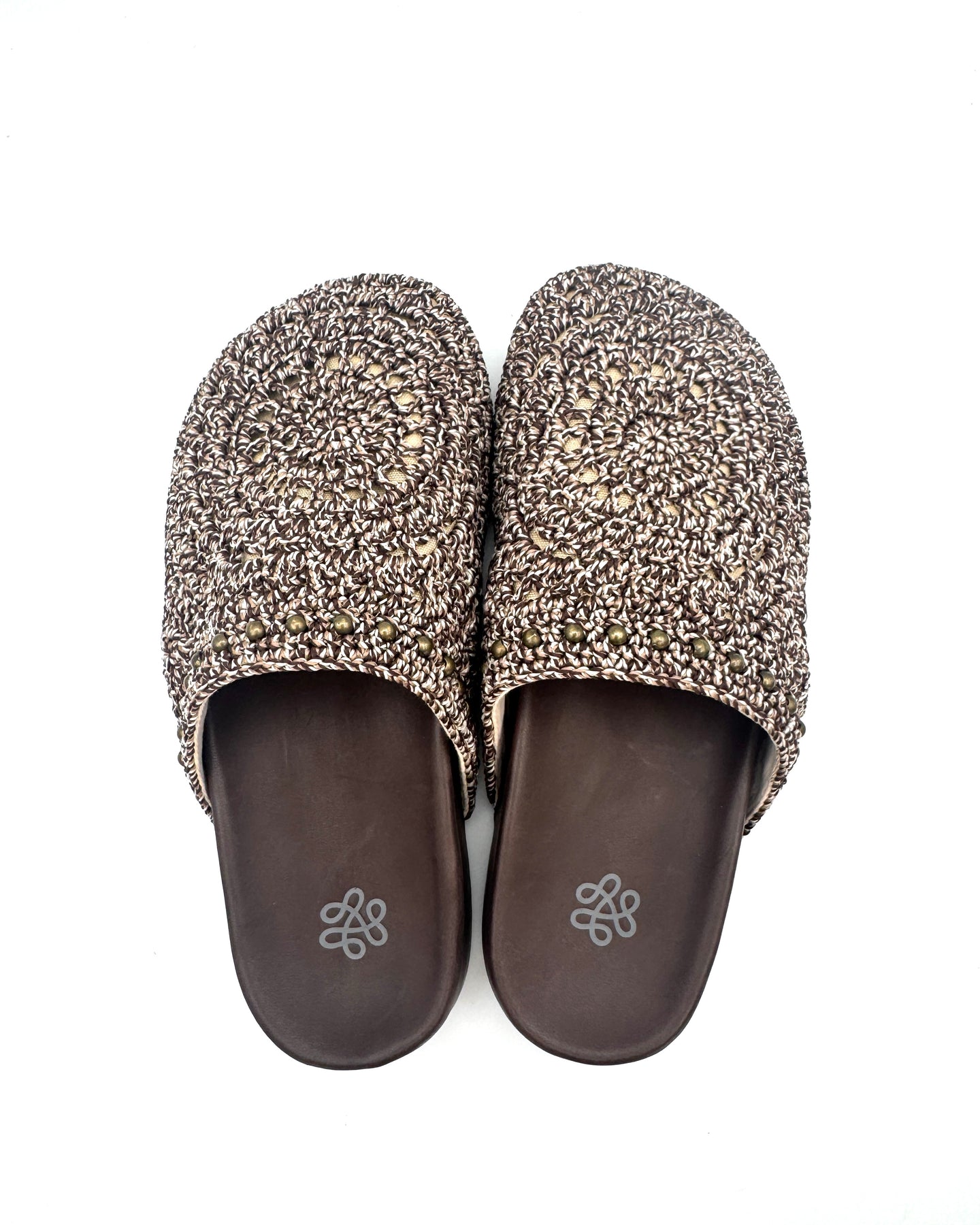 The Sak clog style shoe with backless design, brown open crochet overlay, closed rounded toe with studs on top and dark brown leather insoles with logo monogram on the soles