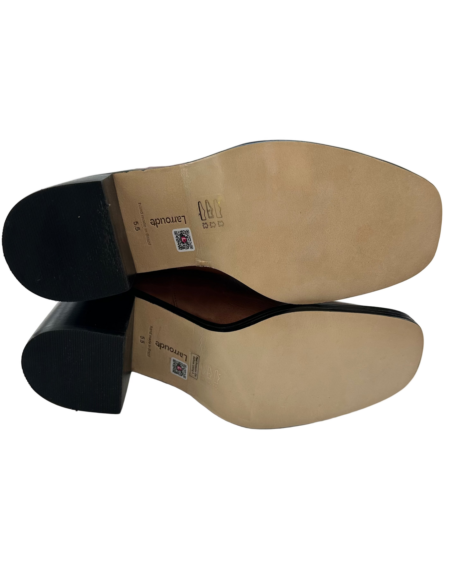 Larroudé brown leather boots with a round toe, 2.5 inch block heel, and approximately 16" tall from the top of the boot to the bottom of the heel. There is discoloration on the leather most likely from photoshoots but shoe is brand new.
