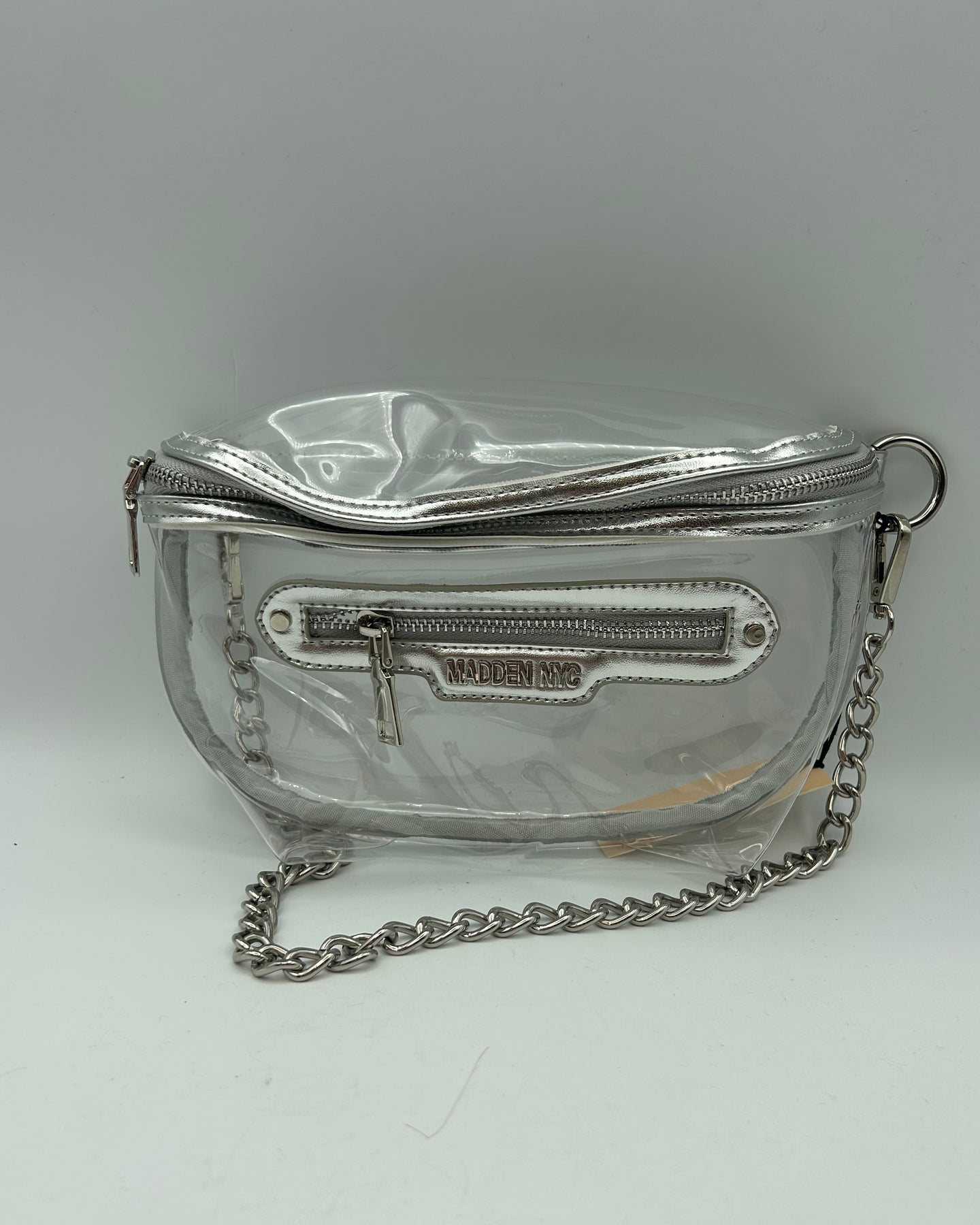 Madden NYC clear bag with silver detailing, silver hardware, top zipper closure and front zipper pocket, metal chain removable shoulder strap, adjustable and removable crossbody strap with a silver coin pouch key chain