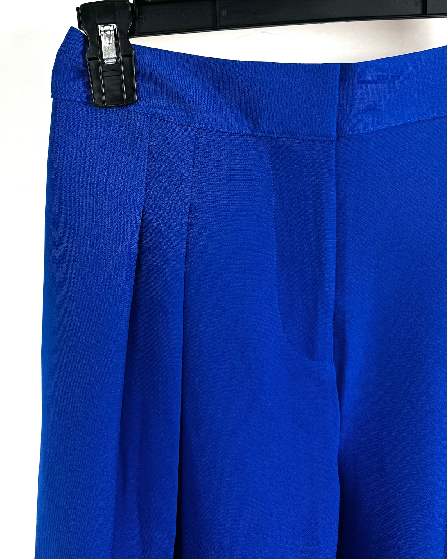 Cobalt Blue trousers, in a capri style, loose fitted, cuffed hem, zipper and clasp closure, faux back pockets and hidden side pockets