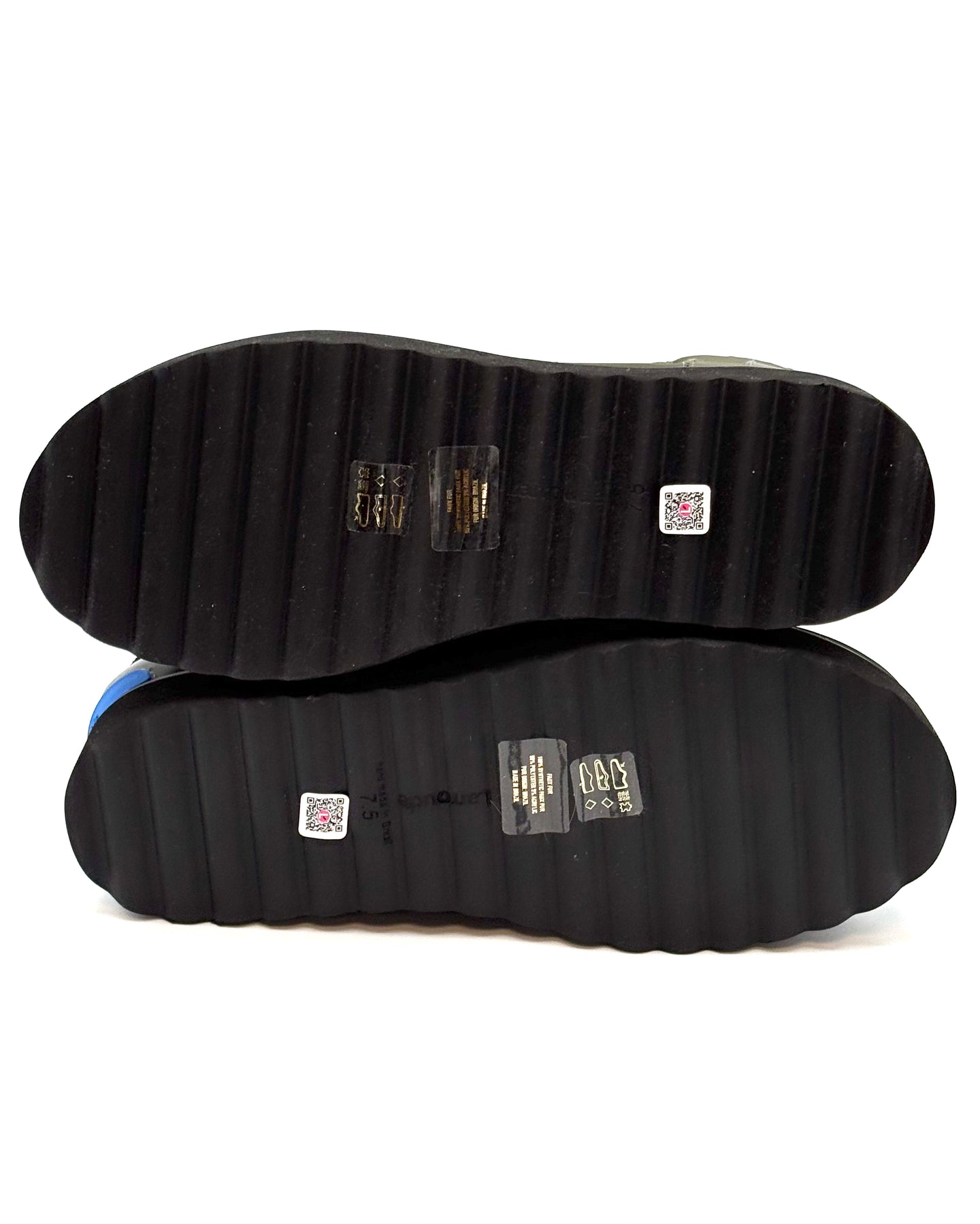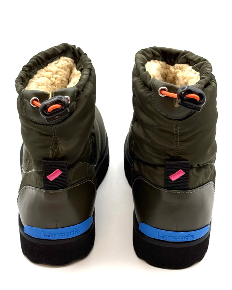 Larroudé bootie in a dark green nylon, black flat 1 inch rubber platform, adjustable ankle closure with orange elastic band, tan faux fur interior lining, blue back detail with Larroude logo and back black and pink loop on back