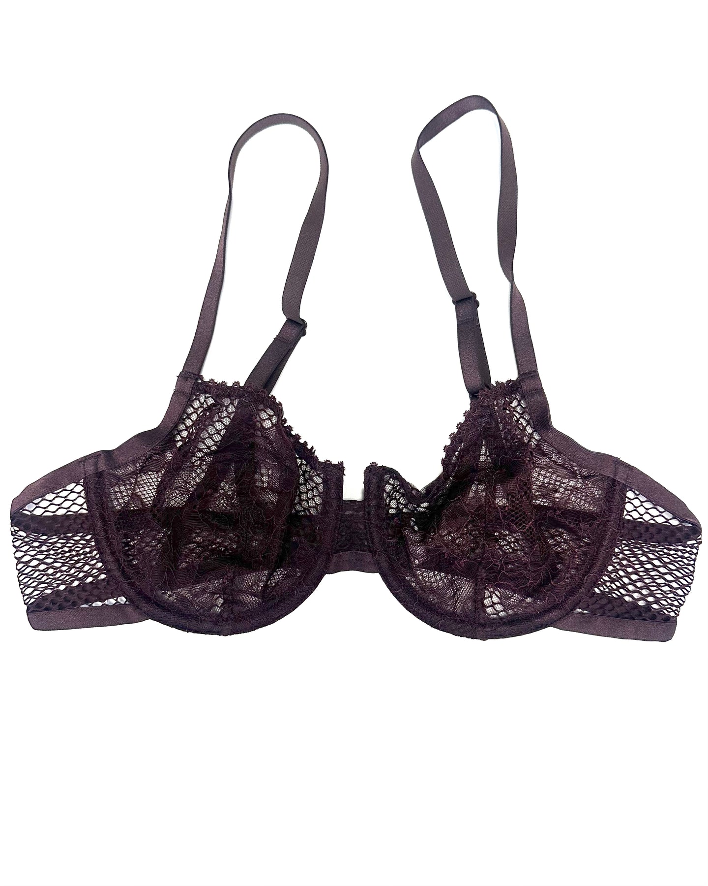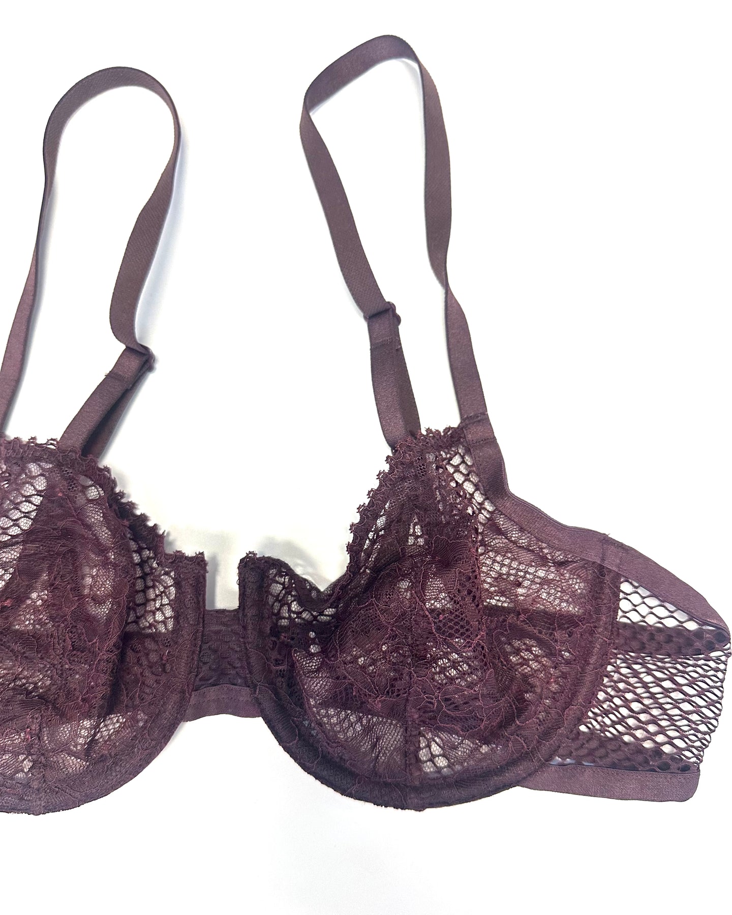 DKNY dark plum sheer lace underwire bra with adjustable straps and adjustable back hook closure