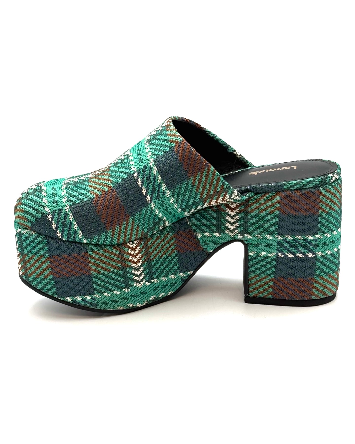 Larroudé platform slip-on clog in a green, brown and cream tweed fabric with rounded closed toe and chunky style heel. Please note there are very minor pulls in the tweed but the shoe is brand new with no wear to the sole