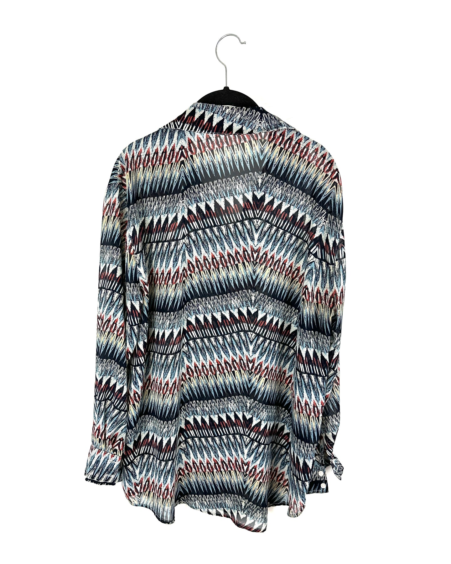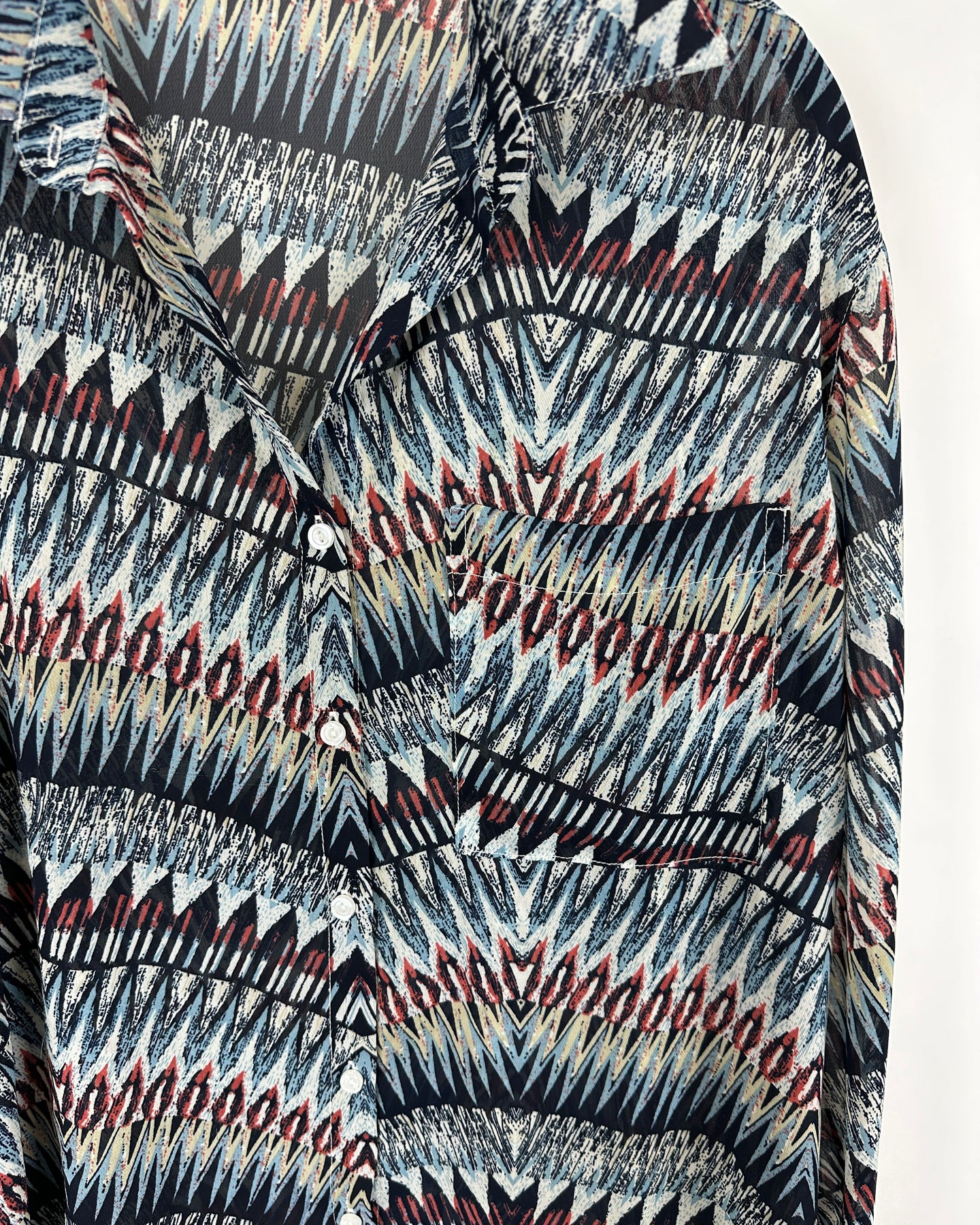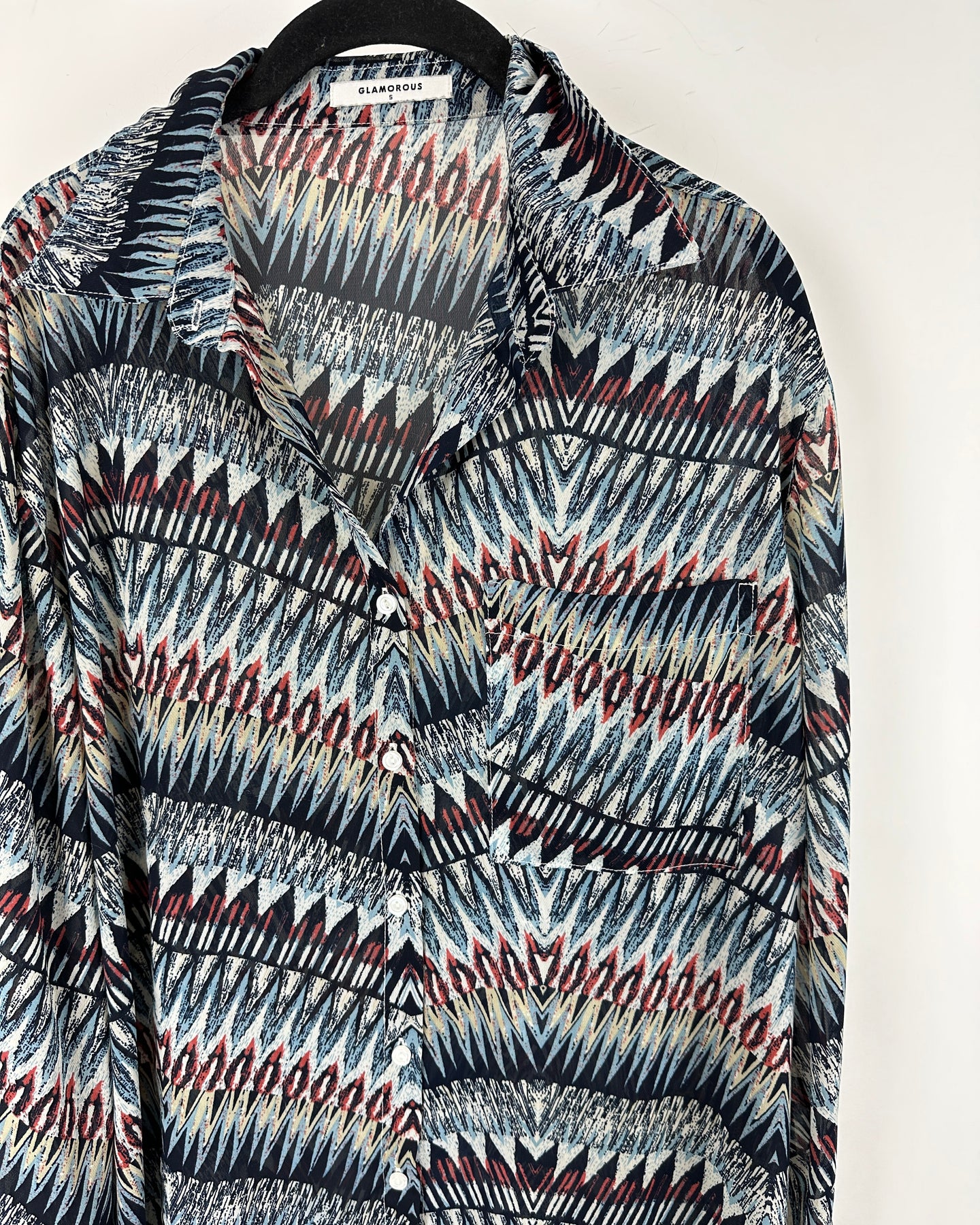 Gently used - Glamorous abstract pattern button-up blouse with sheer material, front pocket, collared neckline, and oversized fit.