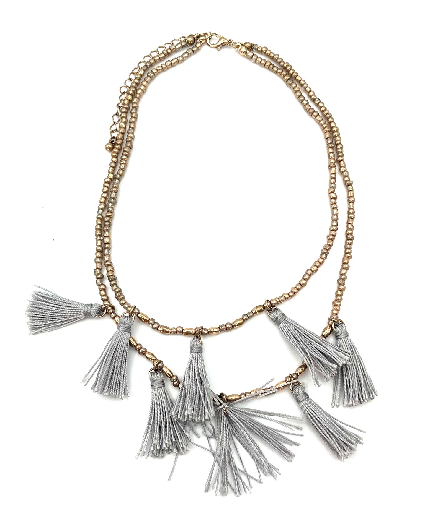Lightweight gold beaded layered necklace, with light grey tassel detailing, and adjustable lobster claw necklace closure
