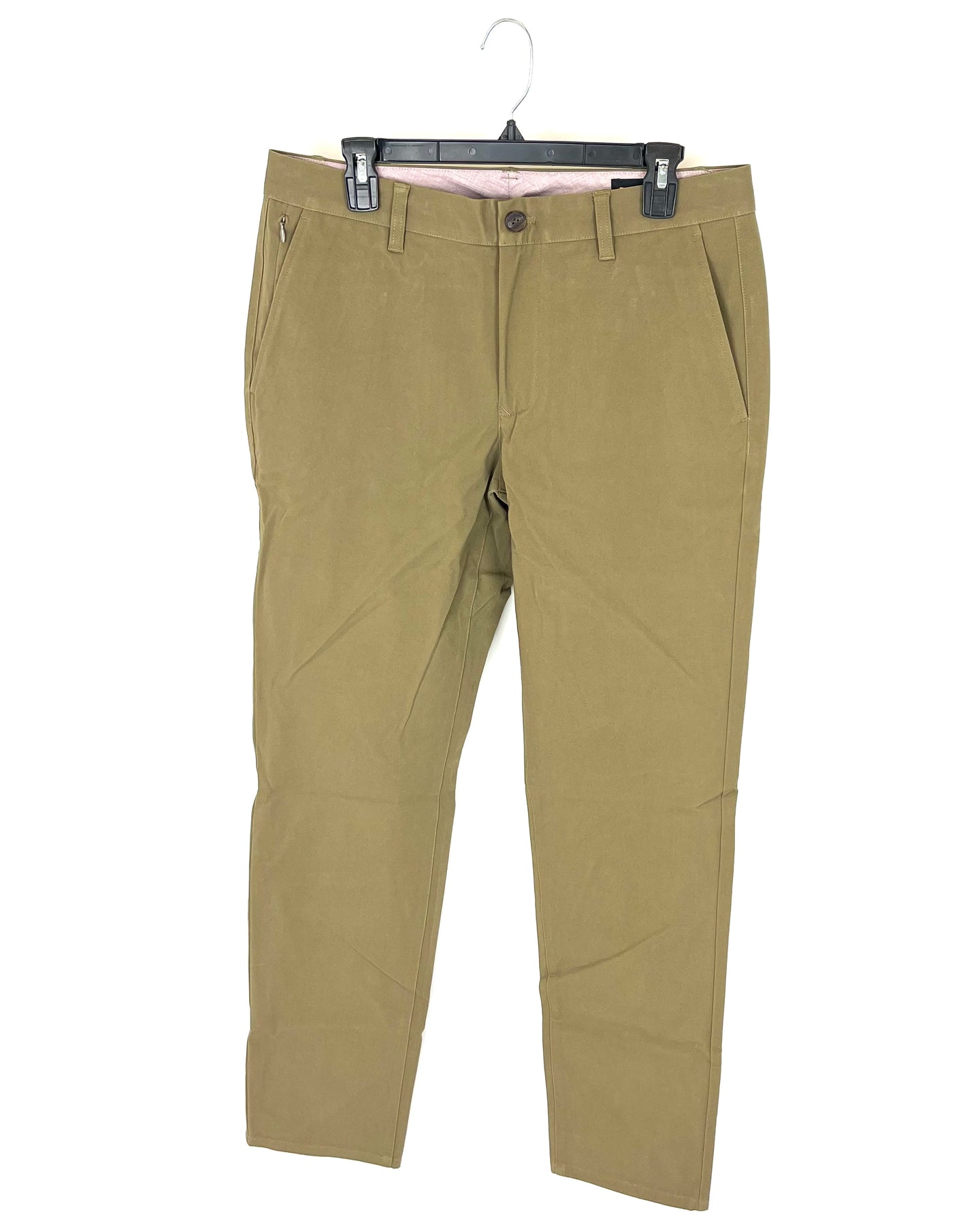 MENS Bonobos dark olive pants with a zipper and button closure, side pockets, one small side zipper pocket, back pockets with a button closure, and belt loops